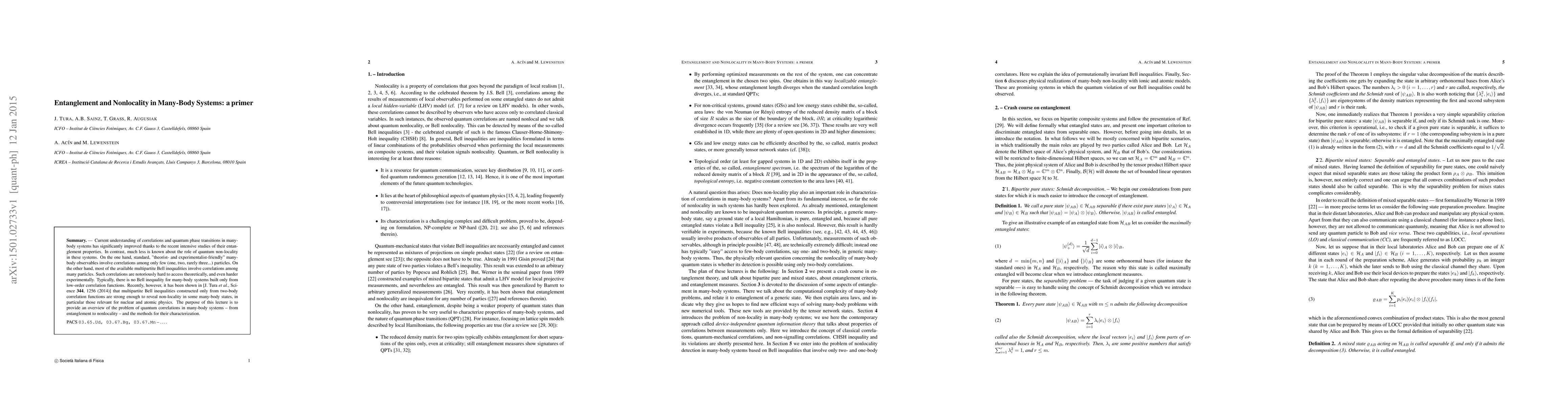 Current understanding of correlations and quantum phase transitions in many-body systems has significantly improved thanks to the recent intensive studies of their entanglement properties. In contrast, much less is known about the role of quantum non-locality in these systems. On the one hand, standard, "theorist- and experimentalist-friendly" many-body observables involve correlations among only few (one, two, rarely three...) particles. On the other hand, most of the available multipartite Bell inequalities involve correlations among many particles. Such correlations are notoriously hard to access theoretically, and even harder experimentally. Typically, there is no Bell inequality for many-body systems built only from low-order correlation functions. Recently, however, it has been shown in [J. Tura et al., Science 344, 1256 (2014)] that multipartite Bell inequalities constructed only from two-body correlation functions are strong enough to reveal non-locality in some many-body states, in particular those relevant for nuclear and atomic physics. The purpose of this lecture is to provide an overview of the problem of quantum correlations in many-body systems - from entanglement to nonlocality - and the methods for their characterization.