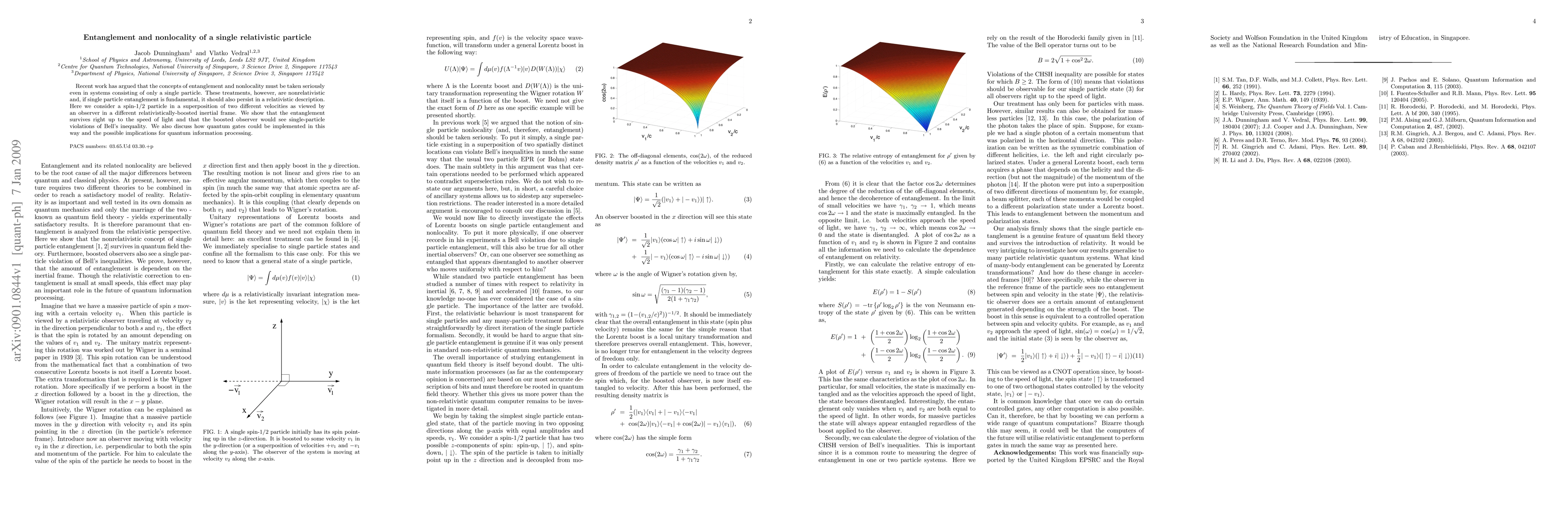 The research considers a spin-1/2 particle in a superposition of two different velocities as viewed by an observer in a relativistically-boosted inertial frame, analyzing entanglement and nonlocality using relativistic quantum mechanics.