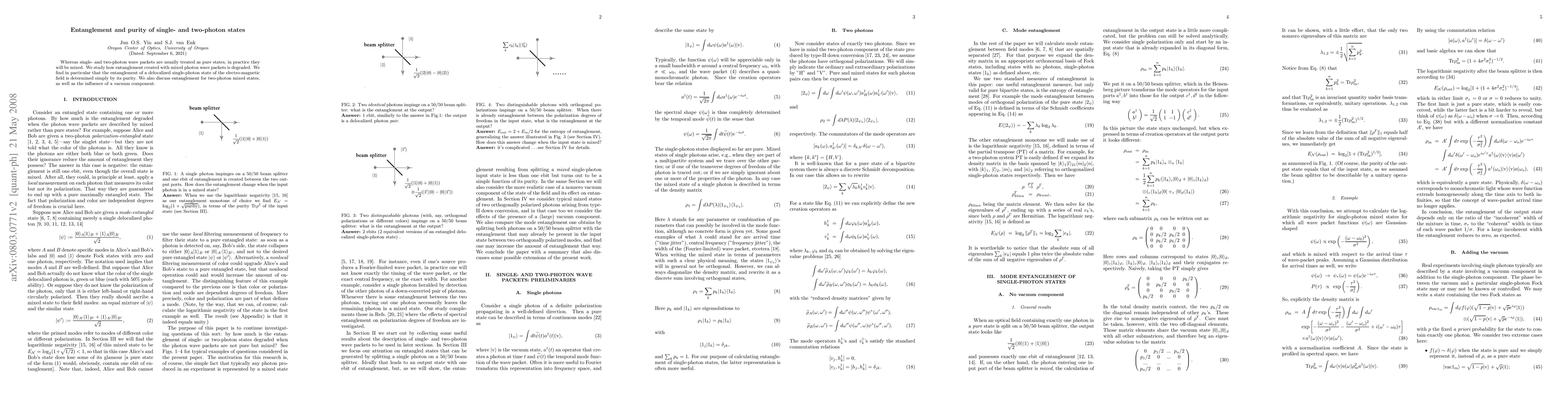 This paper investigates the degradation of entanglement in mixed single- and two-photon states, finding that the entanglement of a delocalized single-photon state is directly tied to its purity. It also explores the implications for two-photon mixed states and the role of a vacuum component in entanglement.