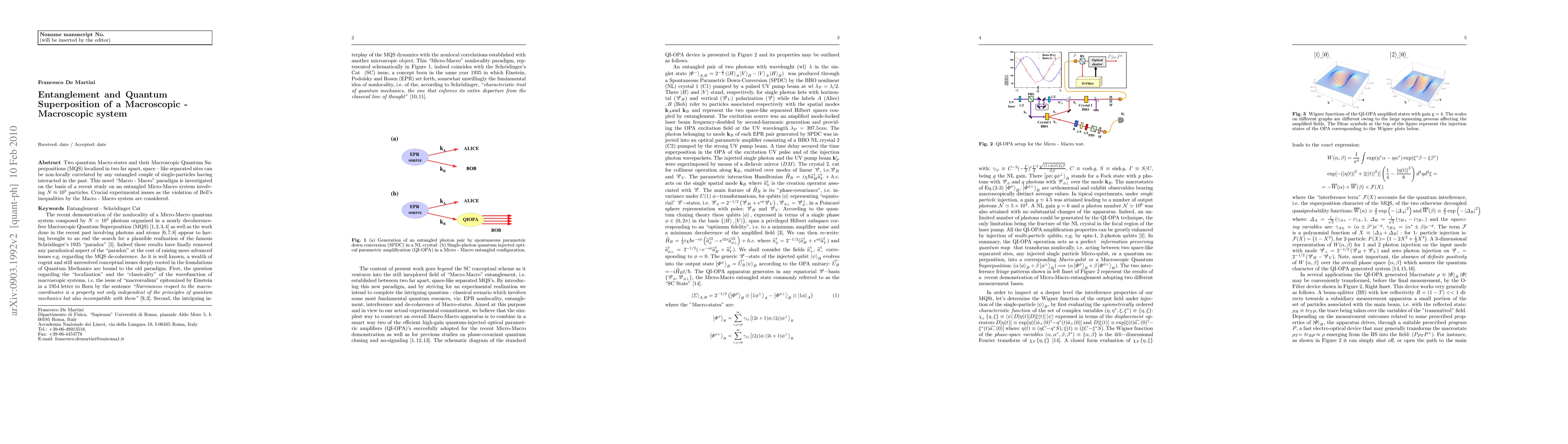 Two quantum Macro-states and their Macroscopic Quantum Superpositions (MQS) localized in two far apart, space - like separated sites can be non-locally correlated by any entangled couple of single-particles having interacted in the past. This novel Macro - Macro paradigm is investigated on the basis of a recent study on an entangled Micro-Macro system involving N=10^5 particles. Crucial experimental issues as the violation of Bell's inequalities by the Macro - Macro system are considered.