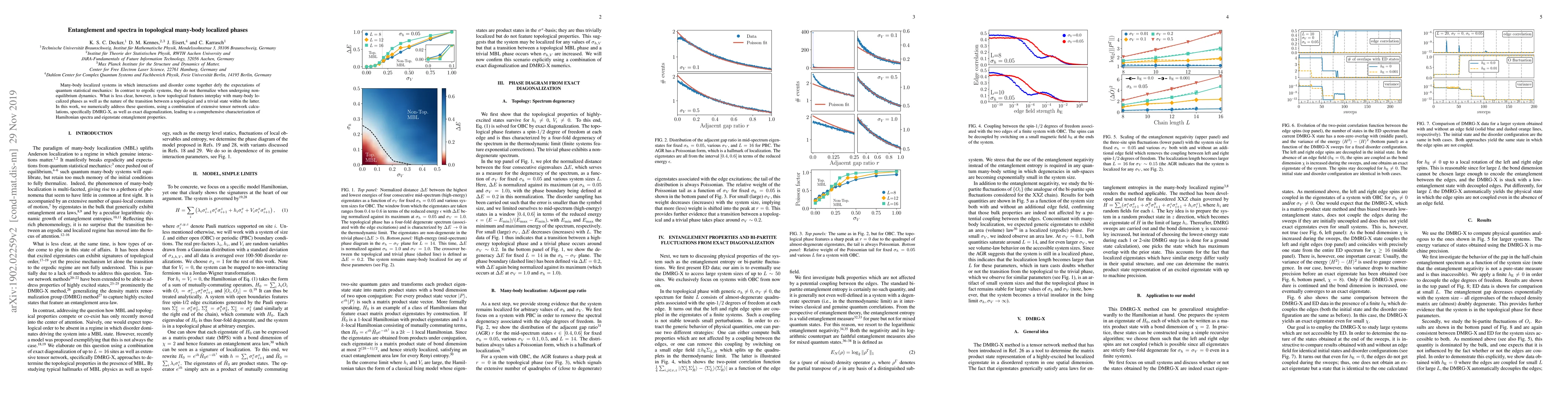 This paper explores the entanglement and spectra in topological many-body localized phases, revealing how topological features interact with localization and characterizing the transition between topological and trivial states using tensor network methods and exact diagonalization.
