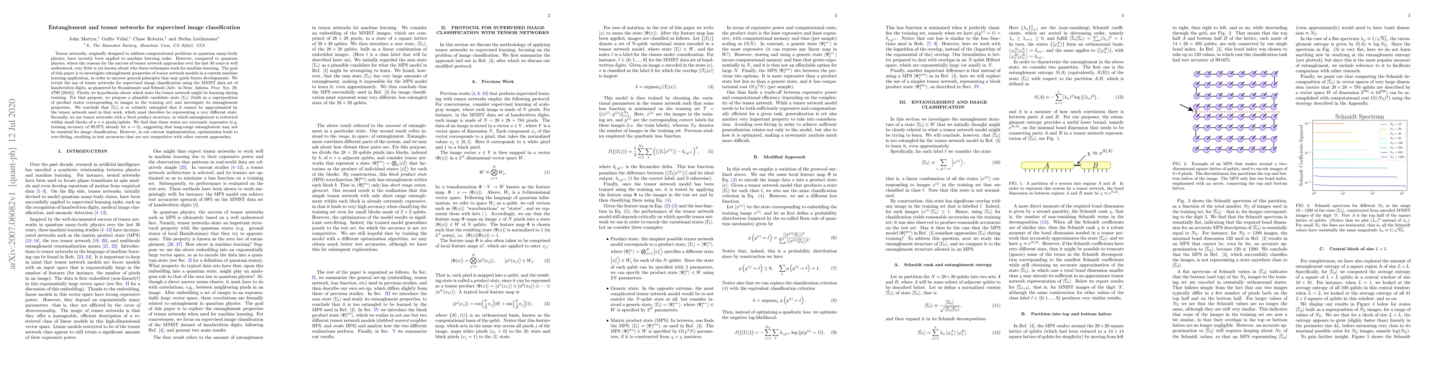 This paper explores the entanglement properties of tensor networks used for supervised image classification, particularly on the MNIST dataset. It hypothesizes that tensor networks may not represent the entangled state of training images but rather a different state, and finds that restricted entanglement within small blocks can achieve high classification accuracy, though optimization leads to overfitting.