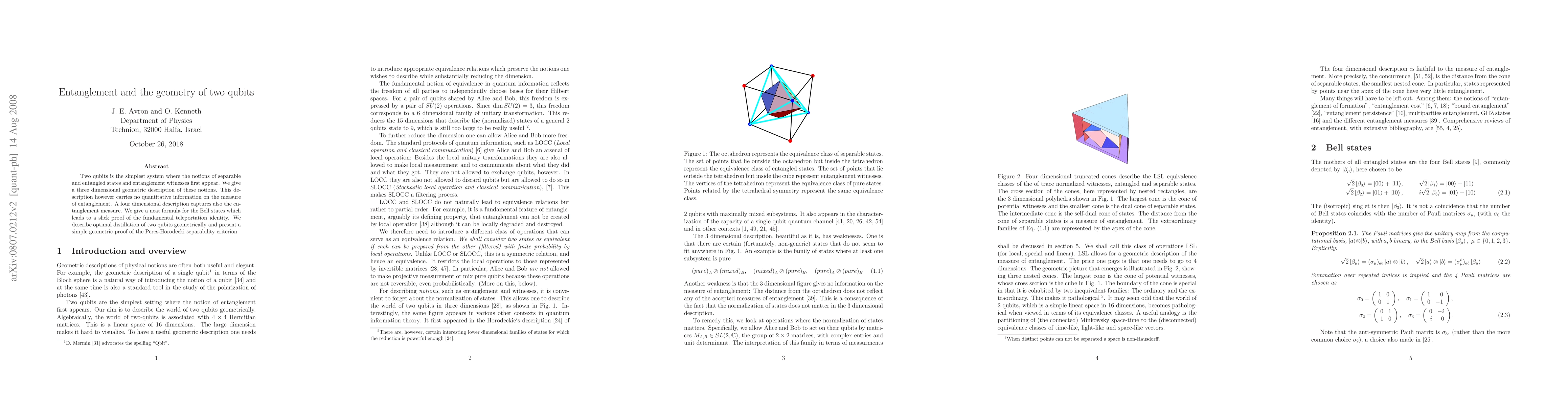 This paper presents a geometric framework for understanding the entanglement of two qubits, offering both three-dimensional and four-dimensional descriptions. It includes a formula for Bell states and a proof of the teleportation identity, along with a geometric proof of the Peres-Horodecki separability criterion.