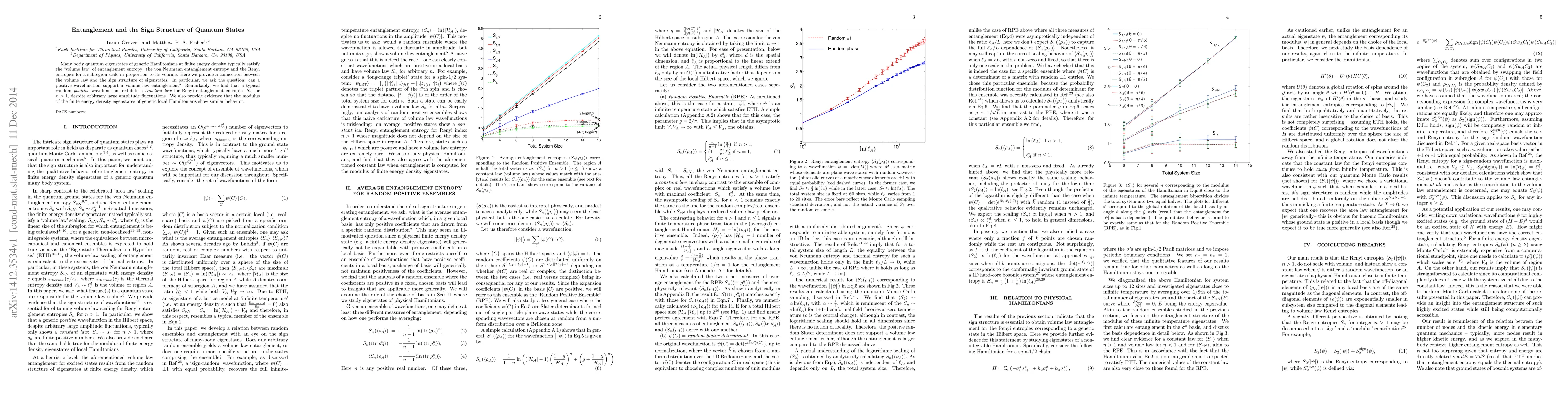 This paper explores the relationship between entanglement entropy scaling and the sign structure of quantum states, finding that typical random positive wavefunctions exhibit a constant law for Renyi entanglement entropies despite large amplitude fluctuations, suggesting similar behavior in the modulus of eigenstates of generic local Hamiltonians.