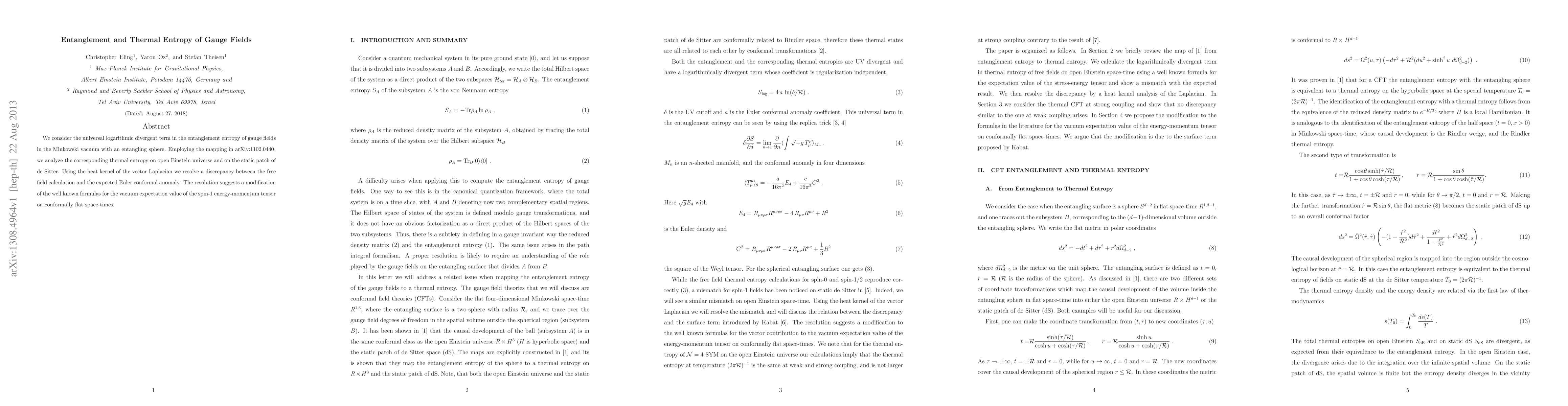 This paper investigates the entanglement entropy of gauge fields in Minkowski vacuum, revealing a universal logarithmic divergence. It resolves discrepancies in thermal entropy calculations by employing the heat kernel of the vector Laplacian, suggesting modifications to existing formulas for the vacuum expectation value of the spin-1 energy-momentum tensor in conformally flat space-times.
