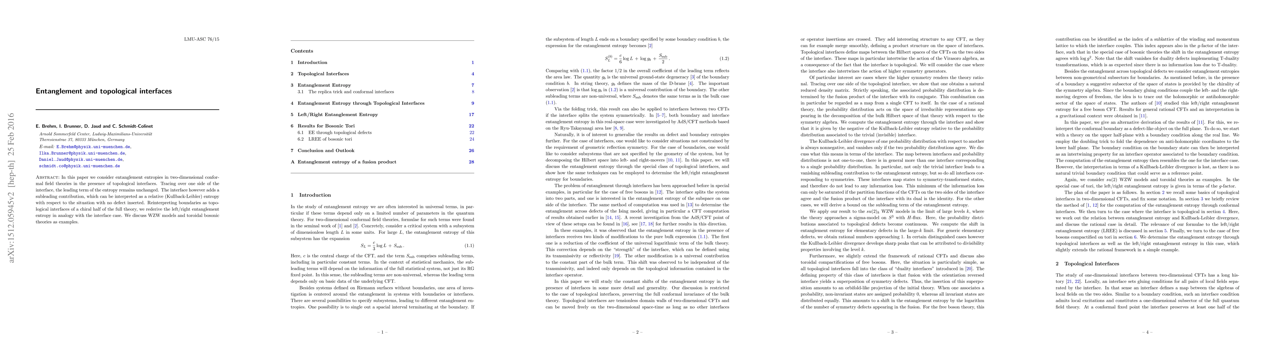 In this paper we consider entanglement entropies in two-dimensional conformal field theories in the presence of topological interfaces. Tracing over one side of the interface, the leading term of the entropy remains unchanged. The interface however adds a subleading contribution, which can be interpreted as a relative (Kullback-Leibler) entropy with respect to the situation with no defect inserted. Reinterpreting boundaries as topological interfaces of a chiral half of the full theory, we rederive the left/right entanglement entropy in analogy with the interface case. We discuss WZW models and toroidal bosonic theories as examples.