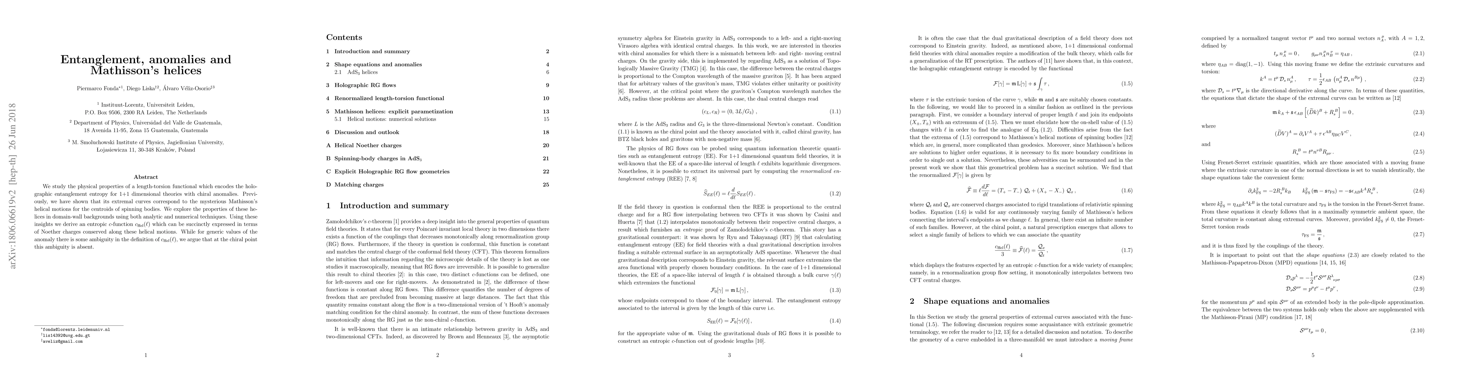 We study the physical properties of a length-torsion functional which encodes the holographic entanglement entropy for 1+1 dimensional theories with chiral anomalies. Previously, we have shown that its extremal curves correspond to the mysterious Mathisson's helical motions for the centroids of spinning bodies. We explore the properties of these helices in domain-wall backgrounds using both analytic and numerical techniques. Using these insights we derive an entropic $c$-function $c_{\mathrm{Hel}}(\ell)$ which can be succinctly expressed in terms of Noether charges conserved along these helical motions. While for generic values of the anomaly there is some ambiguity in the definition of $c_{\mathrm{Hel}}(\ell)$, we argue that at the chiral point this ambiguity is absent.