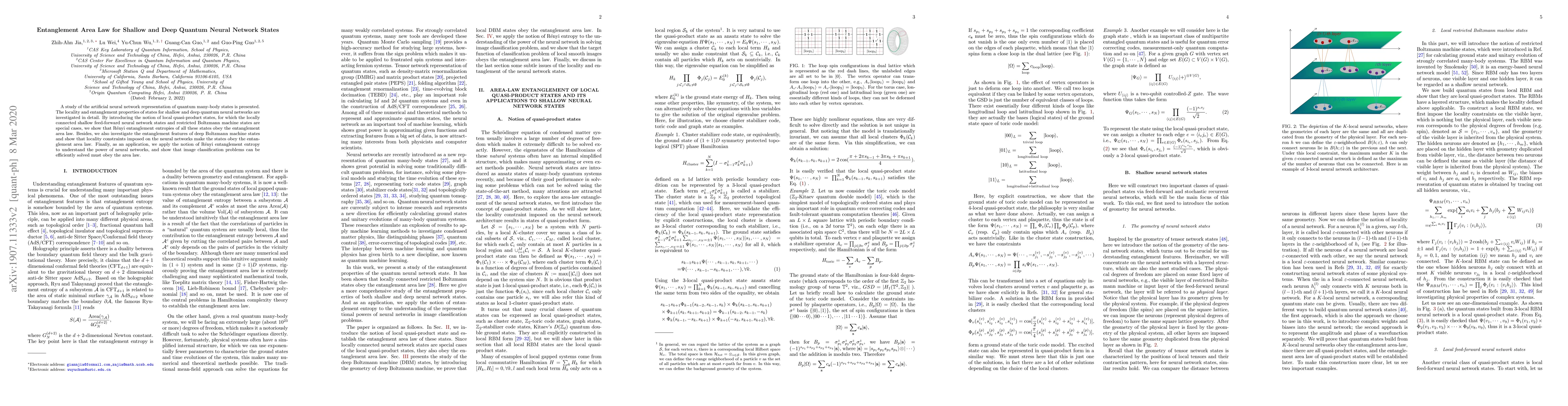 This paper investigates the entanglement properties of quantum neural network states, demonstrating that both shallow and deep networks adhere to the entanglement area law when constrained by locality. It applies Rényi entanglement entropy to show that efficiently solvable image classification problems must also obey the area law.
