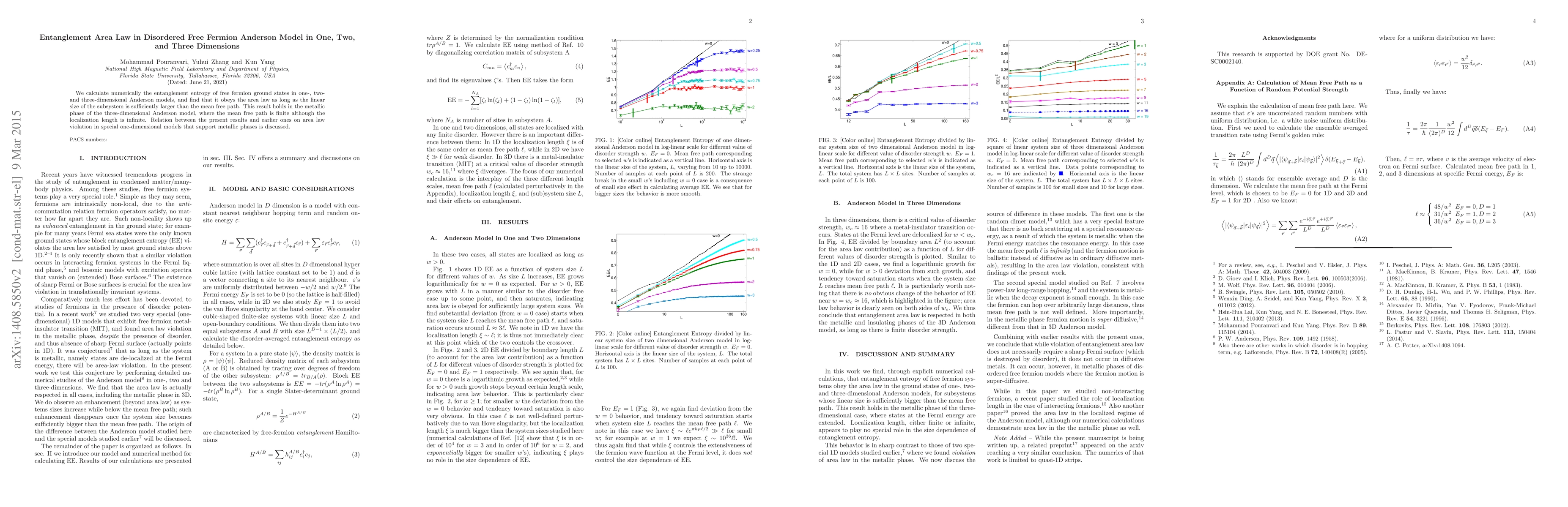 This paper numerically investigates the entanglement entropy in disordered free fermion systems across one, two, and three dimensions, finding that it adheres to the entanglement area law when subsystem size exceeds the mean free path. The study confirms this behavior in the metallic phase of the three-dimensional Anderson model despite infinite localization length.