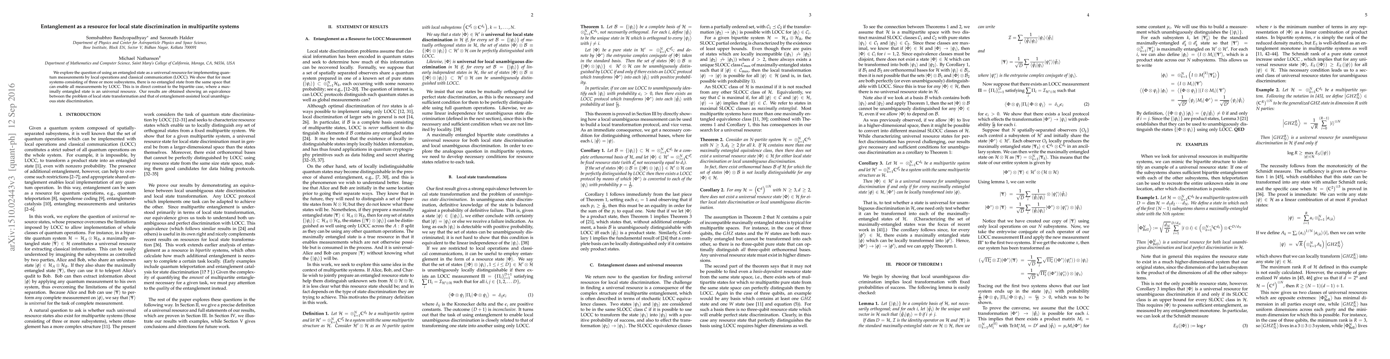 We explore the question of using an entangled state as a universal resource for implementing quantum measurements by local operations and classical communication (LOCC). We show that for most systems consisting of three or more subsystems, there is no entangled state from the same space that can enable all measurements by LOCC. This is in direct contrast to the bipartite case, where a maximally entangled state is an universal resource. Our results are obtained showing an equivalence between the problem of local state transformation and that of entanglement-assisted local unambiguous state discrimination.