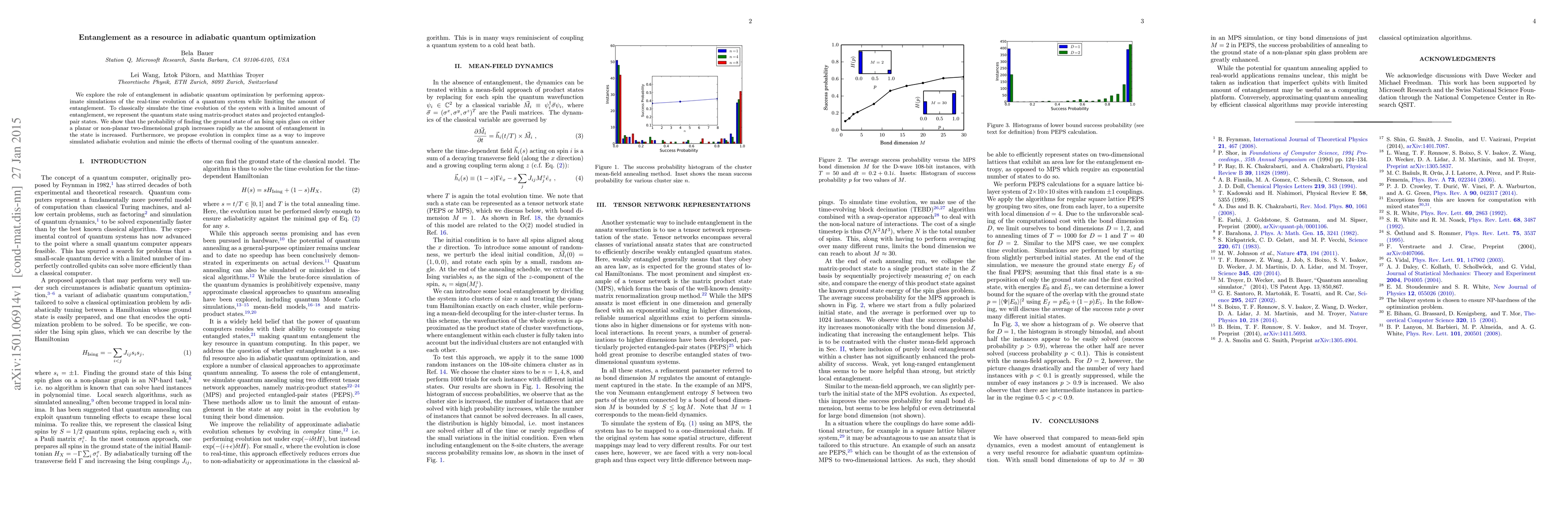 We explore the role of entanglement in adiabatic quantum optimization by performing approximate simulations of the real-time evolution of a quantum system while limiting the amount of entanglement. To classically simulate the time evolution of the system with a limited amount of entanglement, we represent the quantum state using matrix-product states and projected entangled-pair states. We show that the probability of finding the ground state of an Ising spin glass on either a planar or non-planar two-dimensional graph increases rapidly as the amount of entanglement in the state is increased. Furthermore, we propose evolution in complex time as a way to improve simulated adiabatic evolution and mimic the effects of thermal cooling of the quantum annealer.