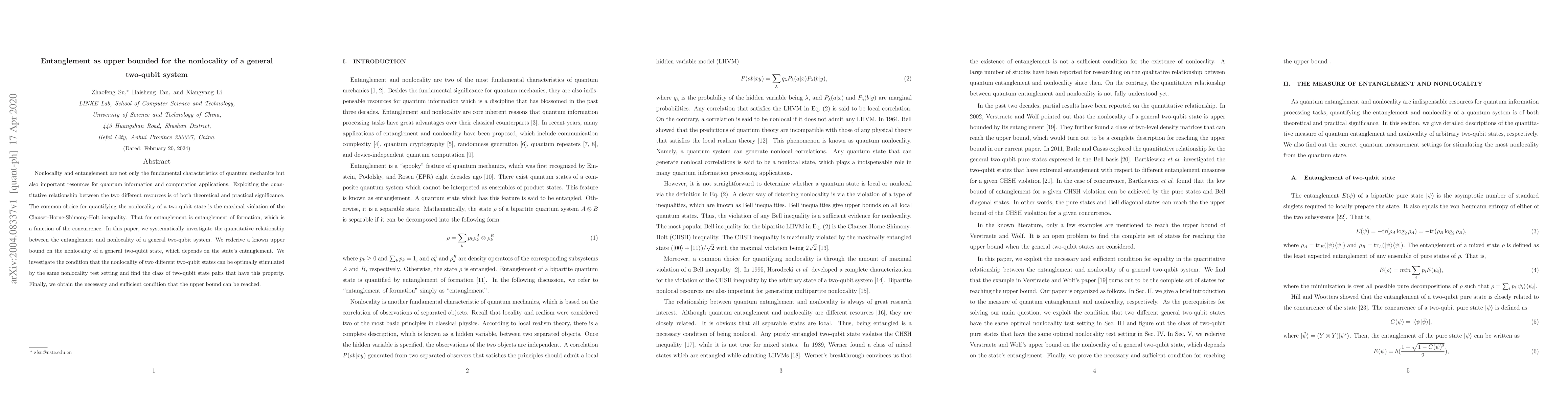 This paper investigates the quantitative relationship between entanglement and nonlocality in general two-qubit systems, deriving an upper bound on nonlocality that depends on the state's entanglement. It also identifies the conditions under which two different states can achieve optimal nonlocality with the same test setting.