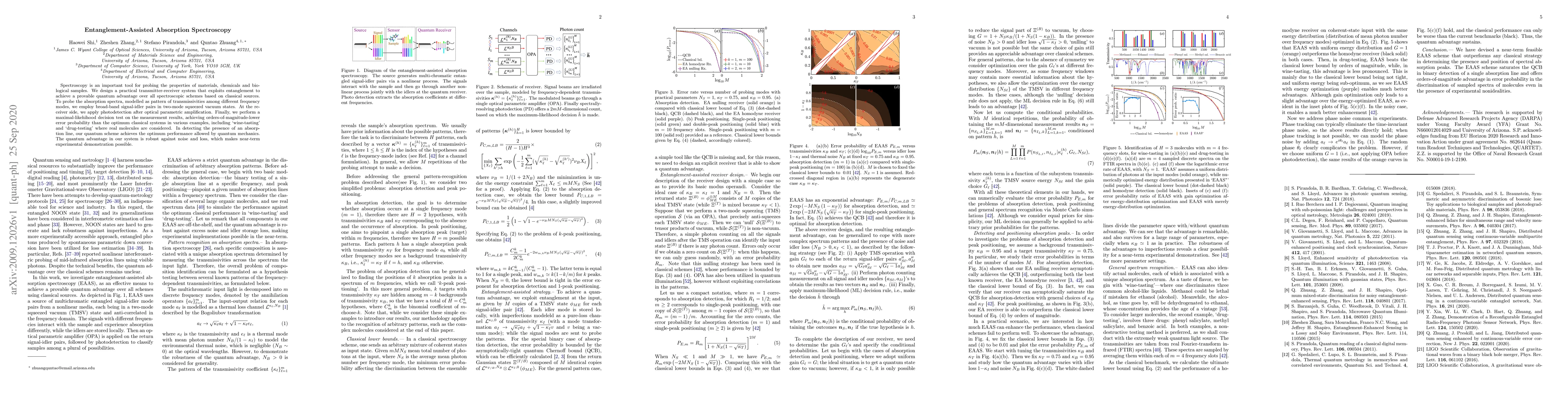 Spectroscopy is an important tool for probing the properties of materials, chemicals and biological samples. We design a practical transmitter-receiver system that exploits entanglement to achieve a provable quantum advantage over all spectroscopic schemes based on classical sources. To probe the absorption spectra, modelled as pattern of transmissivities among different frequency modes, we employ broad-band signal-idler pairs in two-mode squeezed vacuum states. At the receiver side, we apply photodetection after optical parametric amplification. Finally, we perform a maximal-likehihood decision test on the measurement results, achieving orders-of-magnitude-lower error probability than the optimum classical systems in various examples, including `wine-tasting' and `drug-testing' where real molecules are considered. In detecting the presence of an absorption line, our quantum scheme achieves the optimum performance allowed by quantum mechanics. The quantum advantage in our system is robust against noise and loss, which makes near-term experimental demonstration possible.