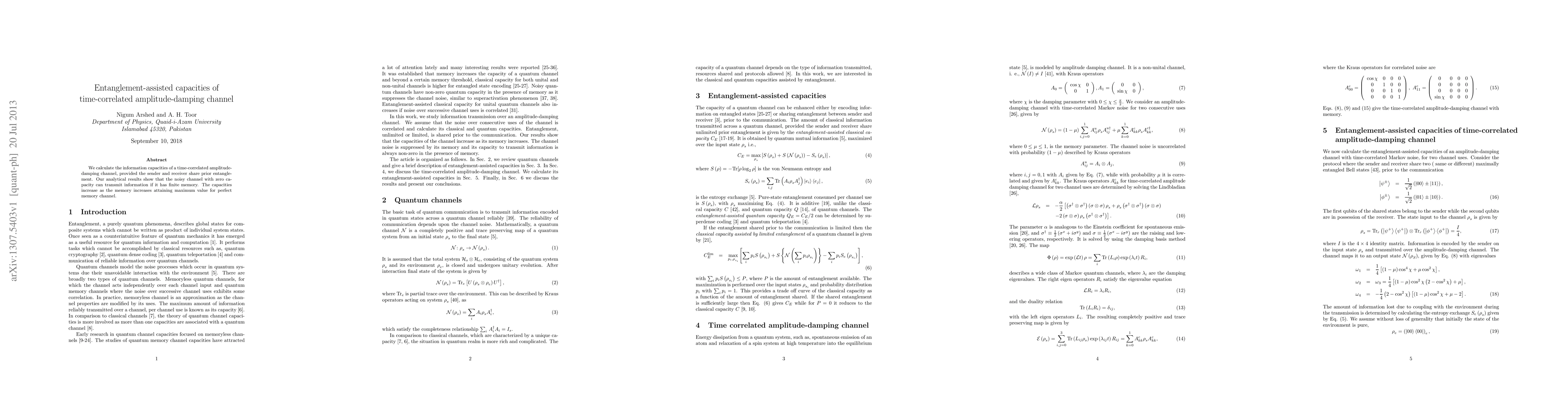 This paper calculates the entanglement-assisted capacities of a time-correlated amplitude-damping channel, demonstrating that shared prior entanglement can enable information transmission even when the channel has zero capacity. The study finds that channel capacity increases with memory, reaching its maximum for a perfect memory channel.
