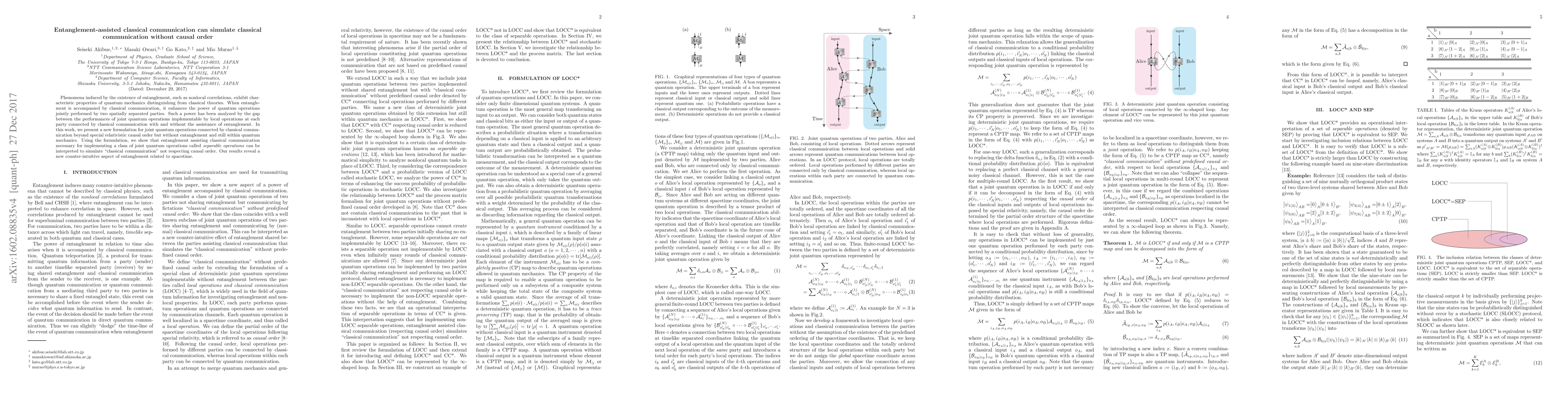 Phenomena induced by the existence of entanglement, such as nonlocal correlations, exhibit characteristic properties of quantum mechanics distinguishing from classical theories. When entanglement is accompanied by classical communication, it enhances the power of quantum operations jointly performed by two spatially separated parties. Such a power has been analyzed by the gap between the performances of joint quantum operations implementable by local operations at each party connected by classical communication with and without the assistance of entanglement. In this work, we present a new formulation for joint quantum operations connected by classical communication beyond special relativistic causal order but without entanglement and still within quantum mechanics. Using the formulation, we show that entanglement assisting classical communication necessary for implementing a class of joint quantum operations called separable maps can be interpreted to simulate "classical communication" not respecting causal order. Our results reveal a new counter-intuitive aspect of entanglement related to spacetime.