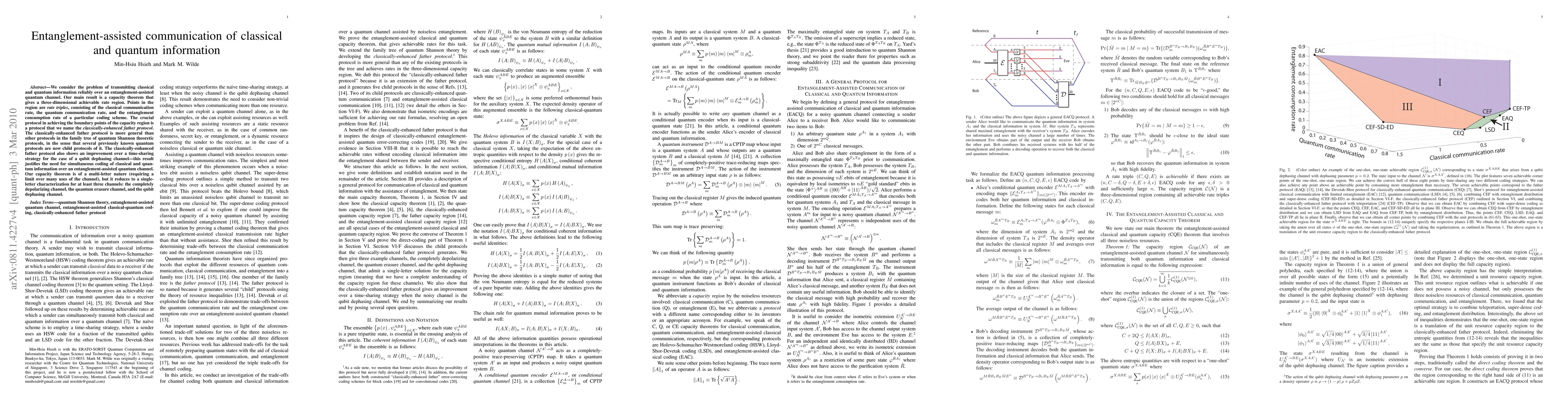 This paper presents a capacity theorem for entanglement-assisted communication over quantum channels, defining a three-dimensional achievable rate region for classical and quantum information transmission. The key protocol, the classically-enhanced father protocol, generalizes existing quantum communication methods and improves upon time-sharing strategies for certain channels.