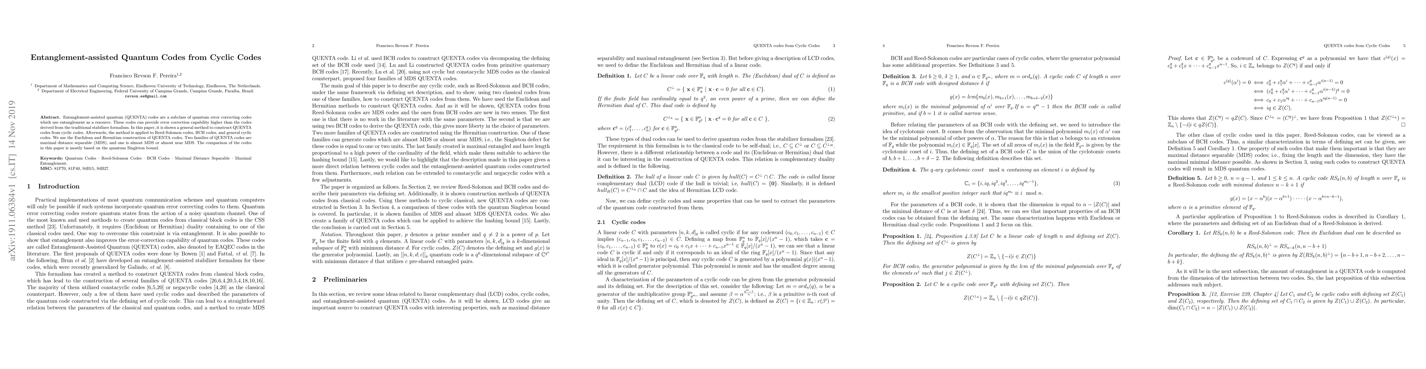 This paper presents a method for constructing entanglement-assisted quantum error-correcting codes (QUENTA codes) from cyclic codes, including Reed-Solomon, BCH, and general cyclic codes. The proposed constructions yield codes that often achieve maximal or near-maximal distance separability and are compared using the quantum Singleton bound.