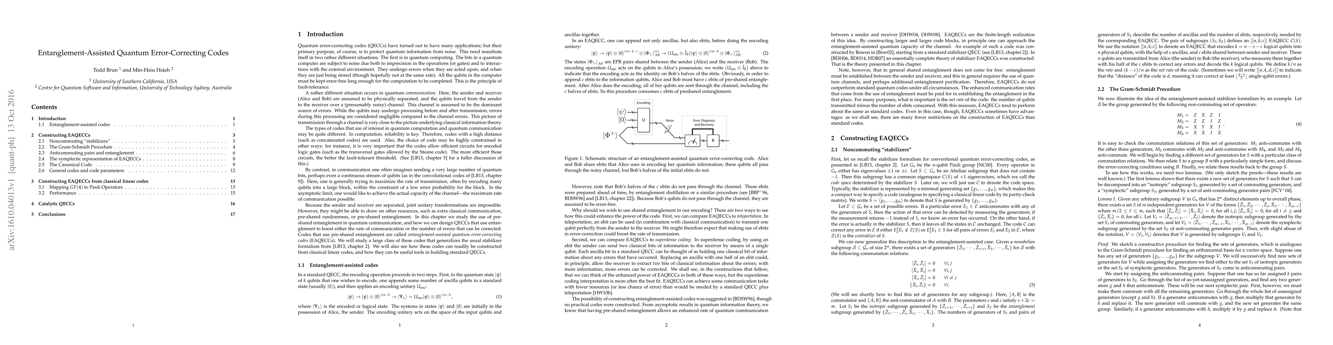 Summary: This chapter introduces entanglement-assisted quantum error-correcting codes, offering a comprehensive overview of their principles and applications in quantum computing to enhance error resilience.
