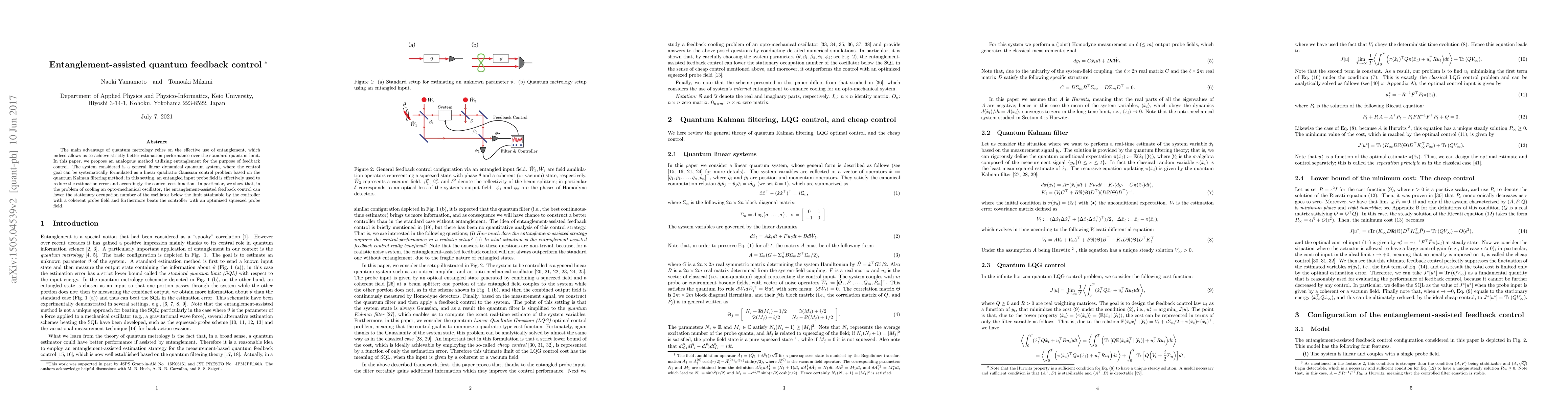 The main advantage of quantum metrology relies on the effective use of entanglement, which indeed allows us to achieve strictly better estimation performance over the standard quantum limit. In this paper, we propose an analogous method uti- lizing entanglement for the purpose of feedback control. The system considered is a general linear dynamical quantum system, where the control goal can be systemati- cally formulated as a linear quadratic Gaussian control problem based on the quantum Kalman filtering method; in this setting, an entangled input probe field is effectively used to reduce the estimation error and accordingly the control cost function. In par- ticular, we show that, in the problem of cooling an opto-mechanical oscillator, the entanglement-assisted feedback control can lower the stationary occupation number of the oscillator below the limit attainable by the controller with a coherent probe field and furthermore beats the controller with an optimized squeezed probe field.