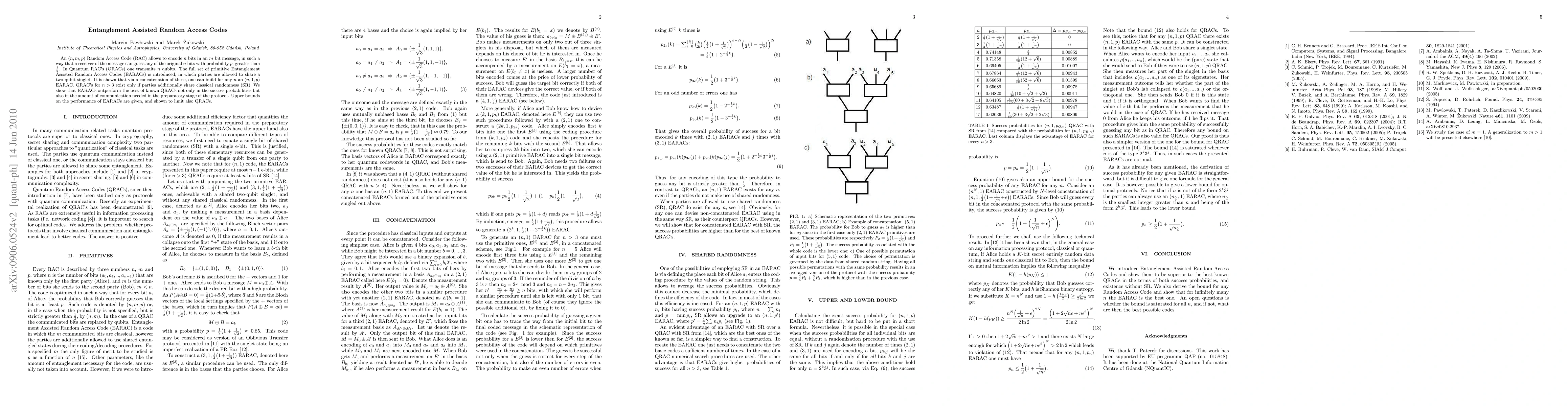 An (n,m,p) Random Access Code (RAC) allows to encode n bits in an m bit message, in such a way that a receiver of the message can guess any of the original $n$ bits with probability p, greater than 1/2. In Quantum RAC's (QRACs) one transmits n qubits. The full set of primitive Entanglement Assisted Random Access Codes (EARACs) is introduced, in which parties are allowed to share a two-qubit singlet. It is shown that via a concatenation of these, one can build for any n an (n,1,p) EARAC. QRAC's for n>3 exist only if parties additionally share classical randomness (SR). We show that EARACs outperform the best of known QRACs not only in the success probabilities but also in the amount of communication needed in the preparatory stage of the protocol. Upper bounds on the performance of EARACs are given, and shown to limit also QRACs.