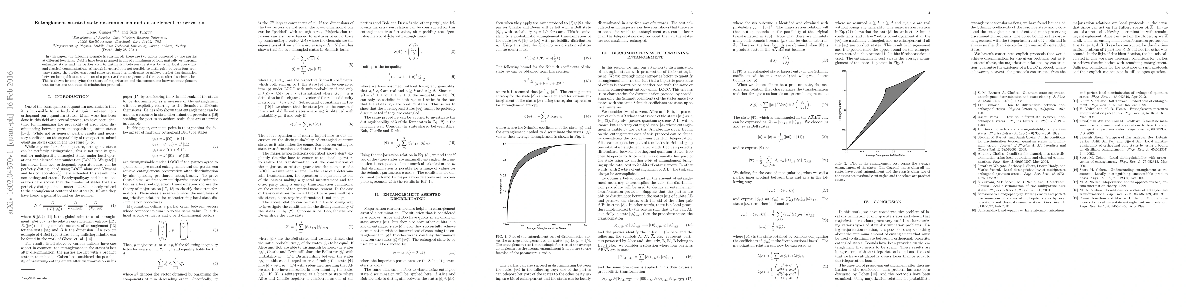 This paper explores how pre-shared entanglement can enable two parties to perfectly distinguish between four mutually-orthogonal entangled qubit states using local operations and classical communication, while also preserving the entanglement post-discrimination, utilizing the theory of majorization and entanglement transformation principles.