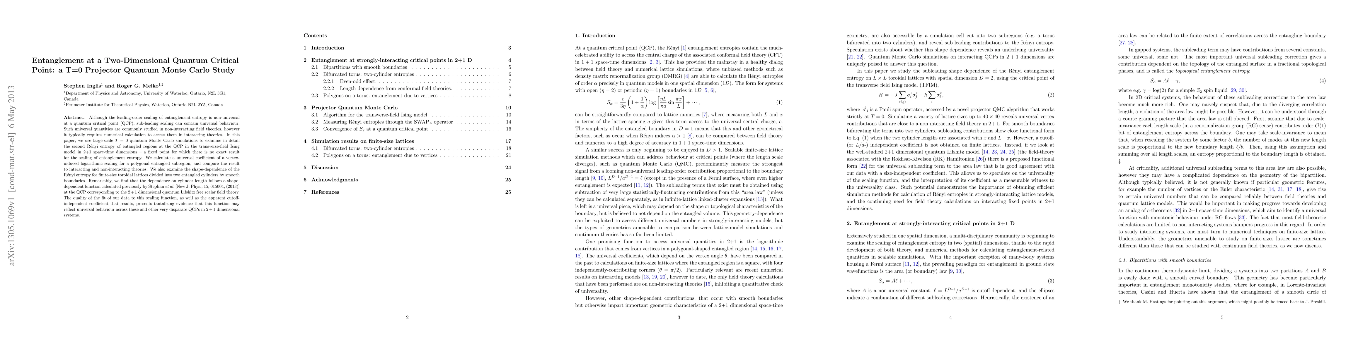 This paper uses T=0 quantum Monte Carlo simulations to study the second R\'enyi entropy at a quantum critical point in the transverse-field Ising model, revealing a universal logarithmic scaling coefficient. The study also finds that the entanglement entropy's shape-dependence matches a previously calculated scaling function for a different QCP, suggesting universal behavior across various 2+1 dimensional quantum critical systems.
