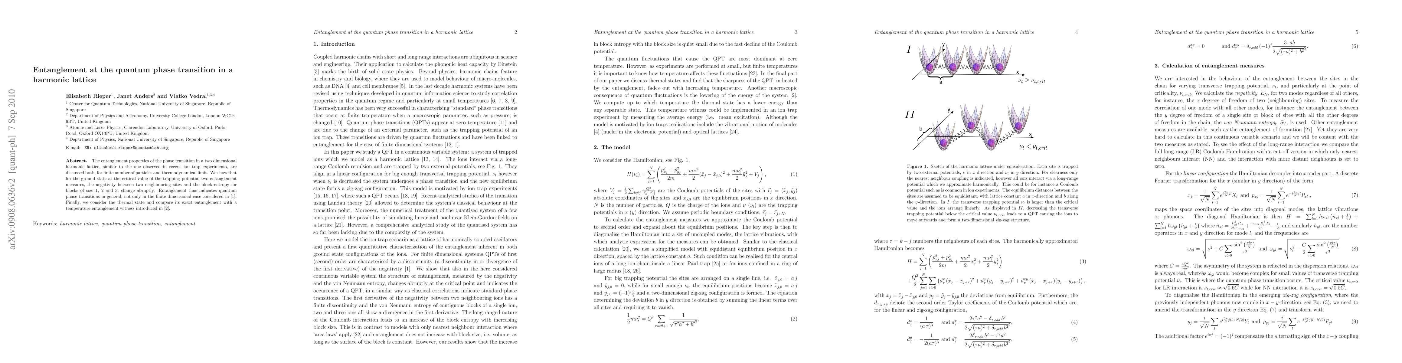 The entanglement properties of the phase transition in a two dimensional harmonic lattice, similar to the one observed in recent ion trap experiments, are discussed both, for finite number of particles and thermodynamical limit. We show that for the ground state at the critical value of the trapping potential two entanglement measures, the negativity between two neighbouring sites and the block entropy for blocks of size 1, 2 and 3, change abruptly. Entanglement thus indicates quantum phase transitions in general; not only in the finite dimensional case considered in [Phys. Rev. Lett. {\bf 93}, 250404 (2004)]. Finally, we consider the thermal state and compare its exact entanglement with a temperature entanglement witness introduced in [Phys. Rev. A {\bf 77} 062102 (2008)].