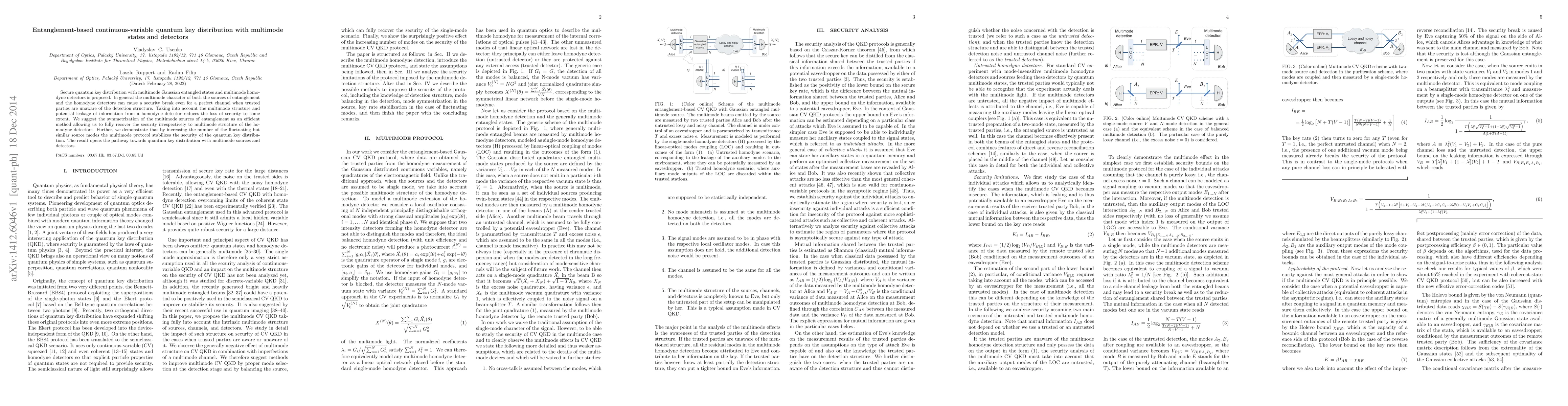 This paper proposes a secure quantum key distribution protocol using multimode Gaussian entangled states and homodyne detectors, addressing security risks due to multimode structures. The authors suggest symmetrization of multimode entanglement sources as a method to fully recover security, and show that increasing the number of similar source modes stabilizes the protocol's security.