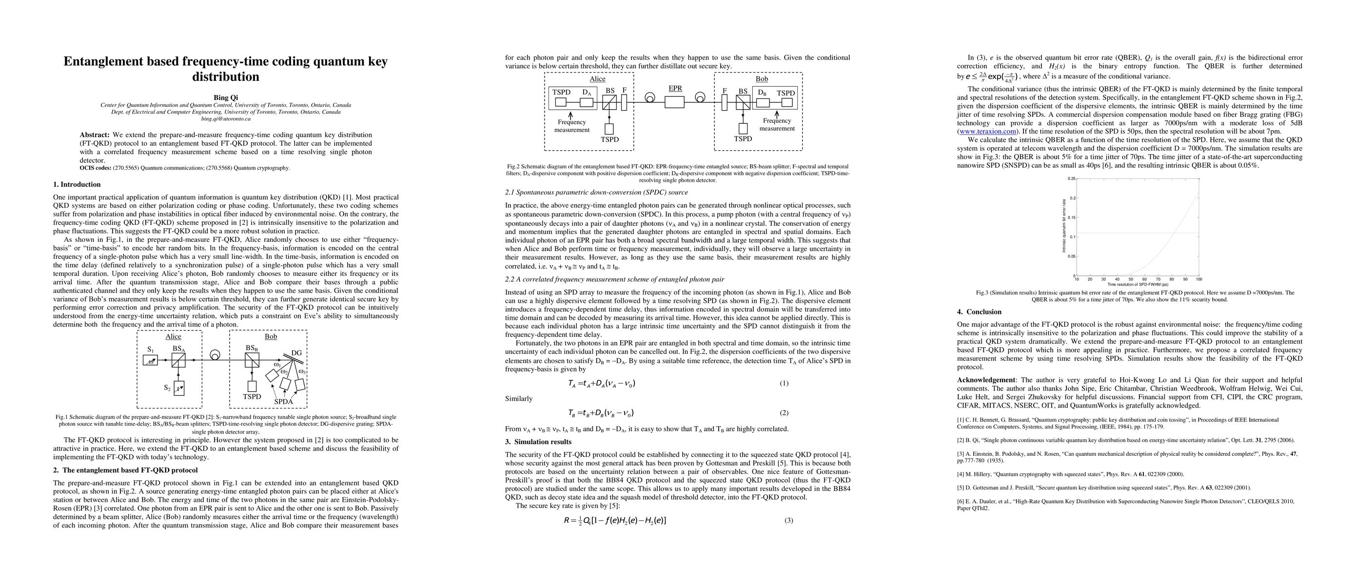 Summary: This research proposes an entanglement-based version of frequency-time coding quantum key distribution (FT-QKD), utilizing correlated frequency measurements through a time-resolving single photon detector for enhanced security. This new protocol aims to improve the efficiency and reliability of quantum key distribution.
