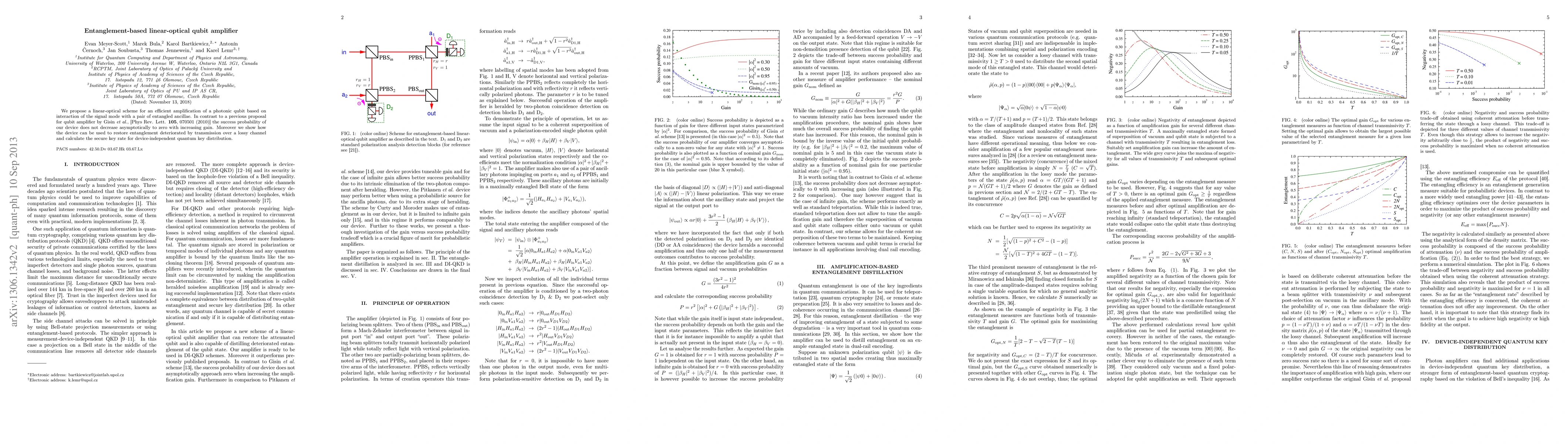 This paper proposes a linear-optical scheme for amplifying a photonic qubit using entangled ancillae, ensuring a non-zero success probability even at high gain. It also demonstrates the device's ability to restore entanglement lost in transmission and calculates the secure key rate for device-independent quantum key distribution.