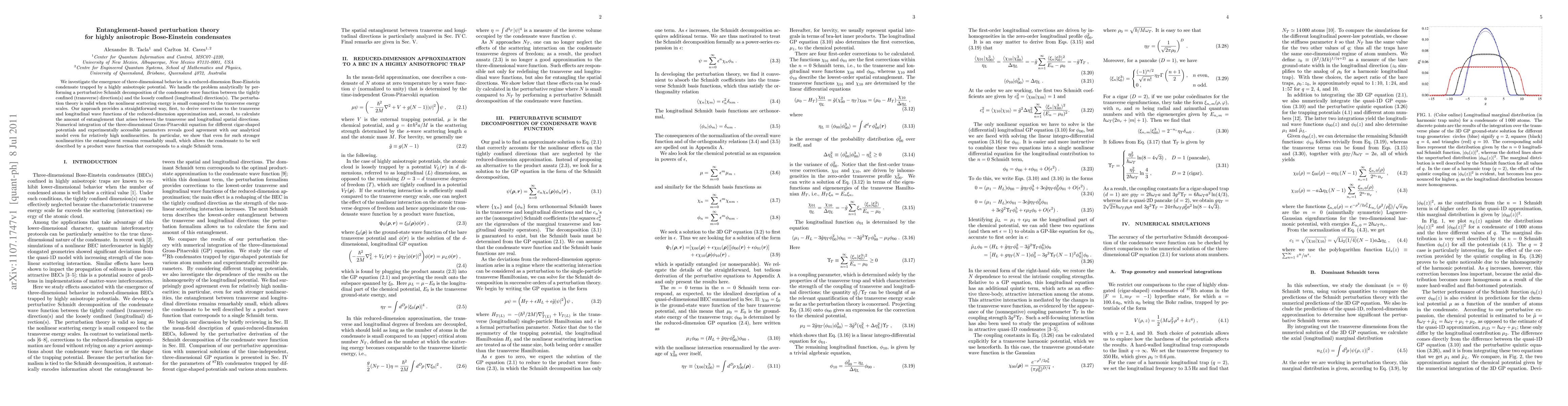 This paper develops an analytical entanglement-based perturbation theory for highly anisotropic Bose-Einstein condensates, showing that despite strong nonlinearities, the entanglement between transverse and longitudinal directions remains minimal, allowing the condensate to be well described by a single Schmidt term. The theory is validated through numerical integration of the Gross-Pitaevskii equation.