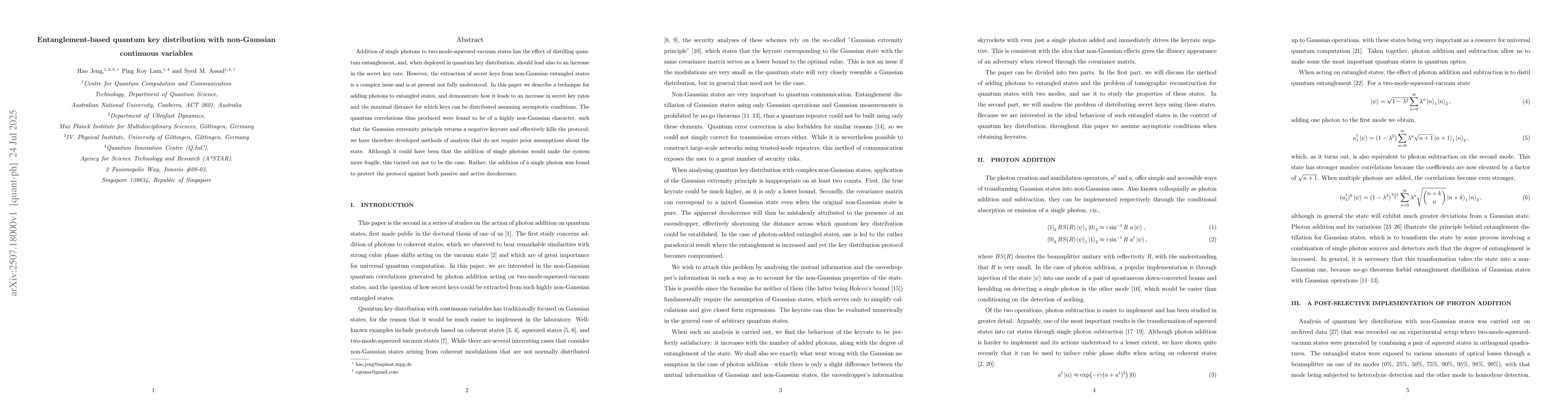 Addition of single photons to two-mode-squeezed-vacuum states has the effect of distilling quantum entanglement, and, when deployed in quantum key distribution, should lead also to an increase in the secret key rate. However, the extraction of secret keys from non-Gaussian entangled states is a complex issue and is at present not fully understood. In this paper we describe a technique for adding photons to entangled states, and demonstrate how it leads to an increase in secret key rates and the maximal distance for which keys can be distributed assuming asymptotic conditions. The quantum correlations thus produced were found to be of a highly non-Gaussian character, such that the Gaussian extremity principle returns a negative keyrate and effectively kills the protocol; we have therefore developed methods of analysis that do not require prior assumptions about the state. Although it could have been that the addition of single photons would make the system more fragile, this turned out not to be the case. Rather, the addition of a single photon was found to protect the protocol against both passive and active decoherence.