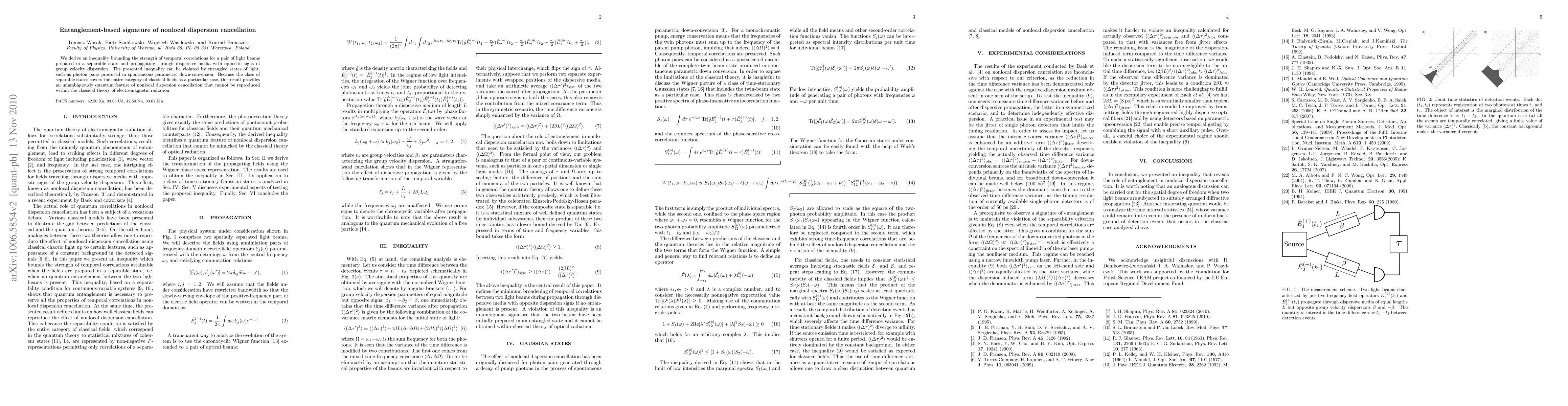 This paper derives an inequality showing temporal correlations for light beams in dispersive media, which can be violated by entangled states, indicating a quantum feature of nonlocal dispersion cancellation not achievable by classical fields. This highlights a unique quantum characteristic of entangled light.