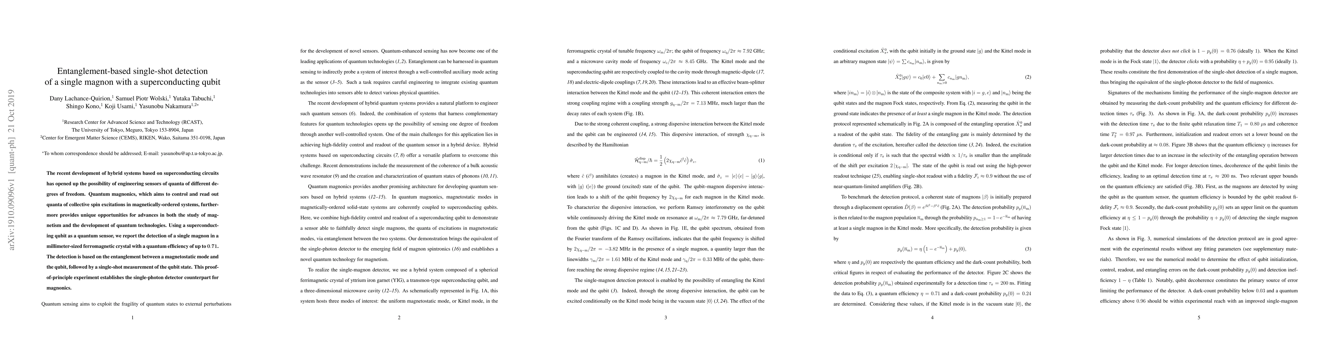 This paper reports the entanglement-based single-shot detection of a single magnon using a superconducting qubit as a quantum sensor, achieving a quantum efficiency of up to 0.71. This proof-of-principle experiment demonstrates the potential for quantum technologies in the study of magnetism and magnonics.
