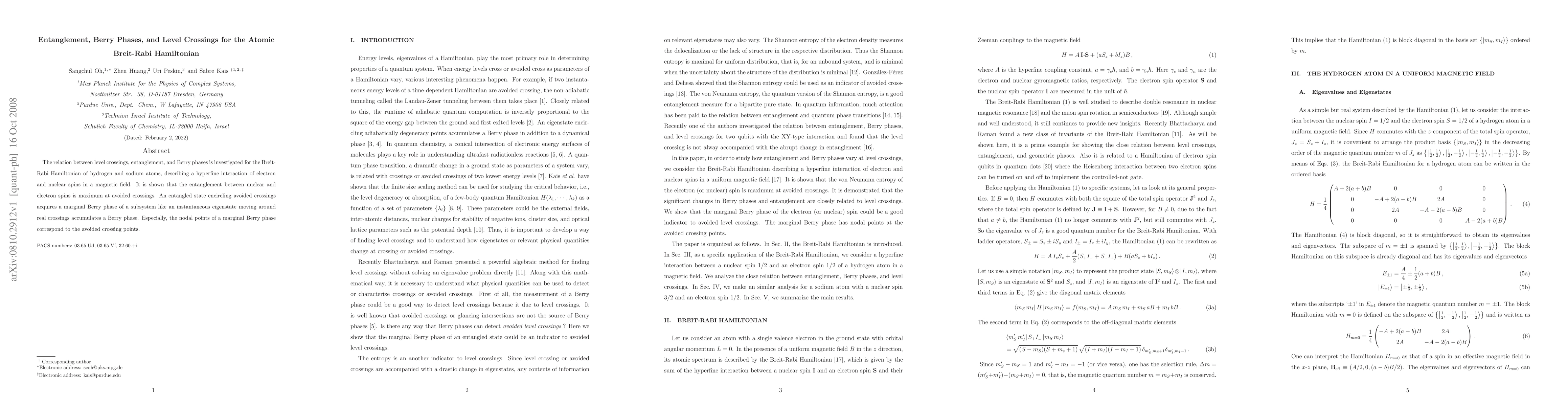 This paper investigates the relationship between entanglement, Berry phases, and level crossings in the Breit-Rabi Hamiltonian for hydrogen and sodium atoms. It finds that entanglement is maximized at avoided crossings and that entangled states encircling these crossings accumulate a marginal Berry phase, analogous to states encircling real crossings.