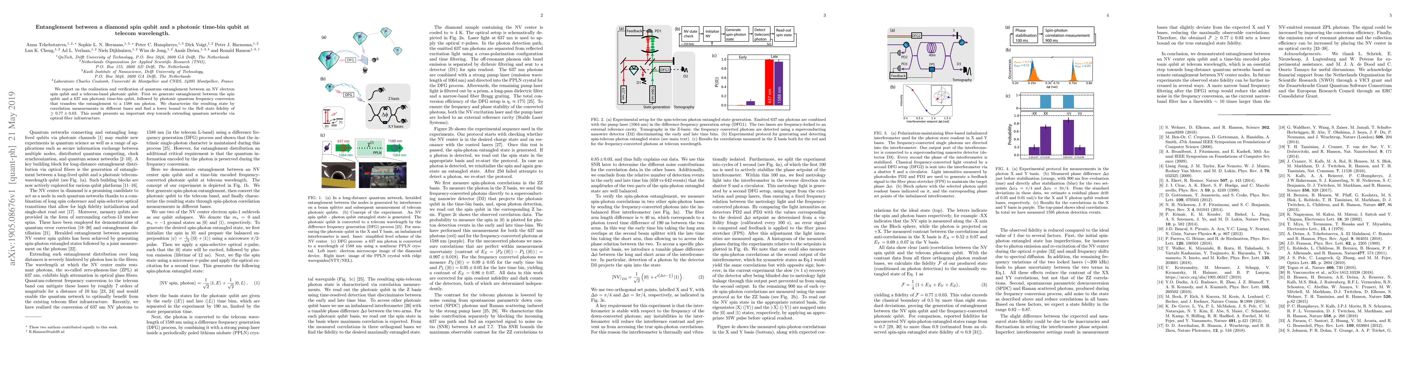 This paper demonstrates the entanglement between an NV electron spin qubit in diamond and a photonic time-bin qubit at telecom wavelength, followed by quantum frequency conversion to extend the entanglement to a 1588 nm photon, achieving a Bell state fidelity of 0.77 +/- 0.03. This advancement is crucial for integrating quantum networks with optical fiber infrastructure.