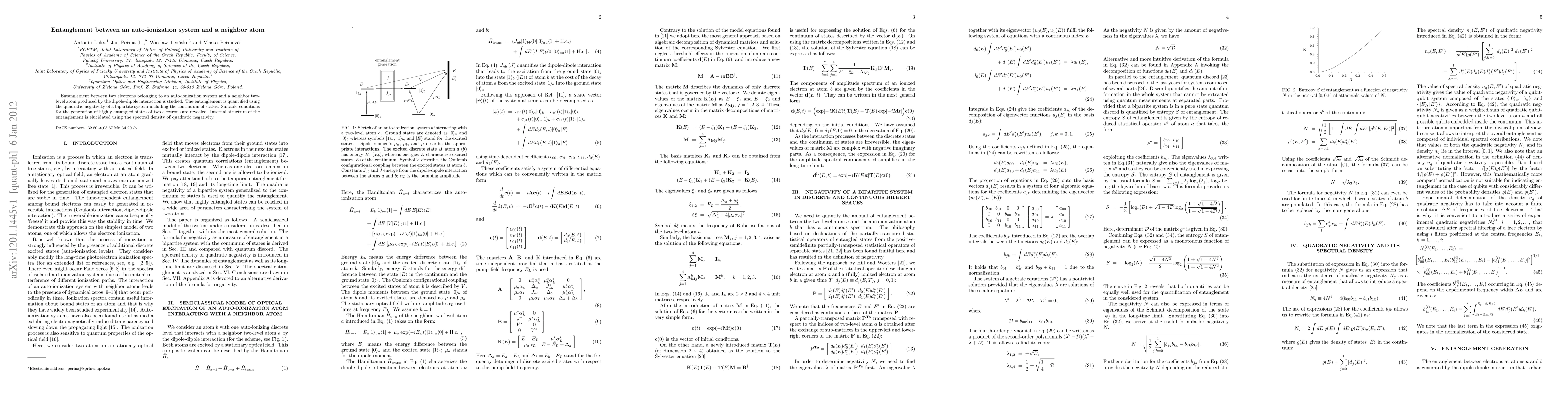 This paper investigates the entanglement between two electrons in an auto-ionization system and a neighboring atom via dipole-dipole interaction, quantifying it using quadratic negativity. It reveals conditions for generating highly entangled states and analyzes the internal structure of this entanglement through spectral density.