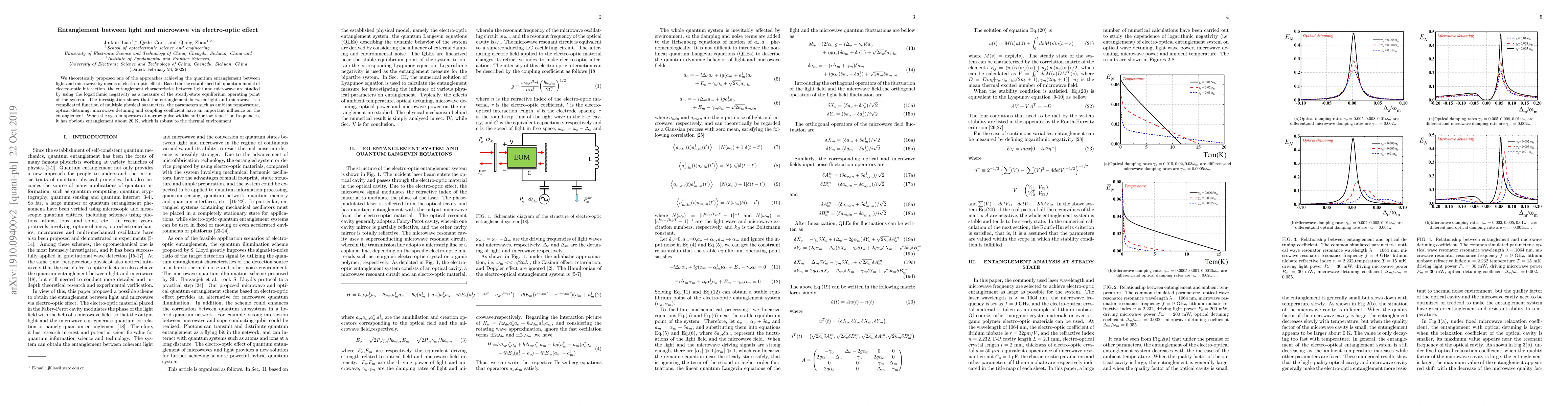 This paper proposes a theoretical method for achieving quantum entanglement between light and microwave using the electro-optic effect. The study reveals that entanglement is significantly influenced by parameters like ambient temperature and detuning, and is robust under specific operational conditions such as narrow pulse widths and low repetition frequencies.