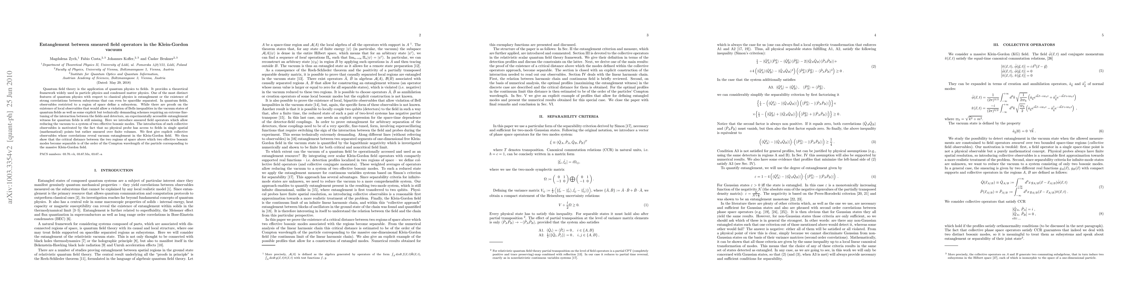 Quantum field theory is the application of quantum physics to fields. It provides a theoretical framework widely used in particle physics and condensed matter physics. One of the most distinct features of quantum physics with respect to classical physics is entanglement or the existence of strong correlations between subsystems that can even be spacelike separated. In quantum fields, observables restricted to a region of space define a subsystem. While there are proofs on the existence of local observables that would allow a violation of Bell's inequalities in the vacuum states of quantum fields as well as some explicit but technically demanding schemes requiring an extreme fine-tuning of the interaction between the fields and detectors, an experimentally accessible entanglement witness for quantum fields is still missing. Here we introduce smeared field operators which allow reducing the vacuum to a system of two effective bosonic modes. The introduction of such collective observables is motivated by the fact that no physical probe has access to fields in single spatial (mathematical) points but rather smeared over finite volumes. We first give explicit collective observables whose correlations reveal vacuum entanglement in the Klein-Gordon field. We then show that the critical distance between the two regions of space above which two effective bosonic modes become separable is of the order of the Compton wavelength of the particle corresponding to the massive Klein-Gordon field.