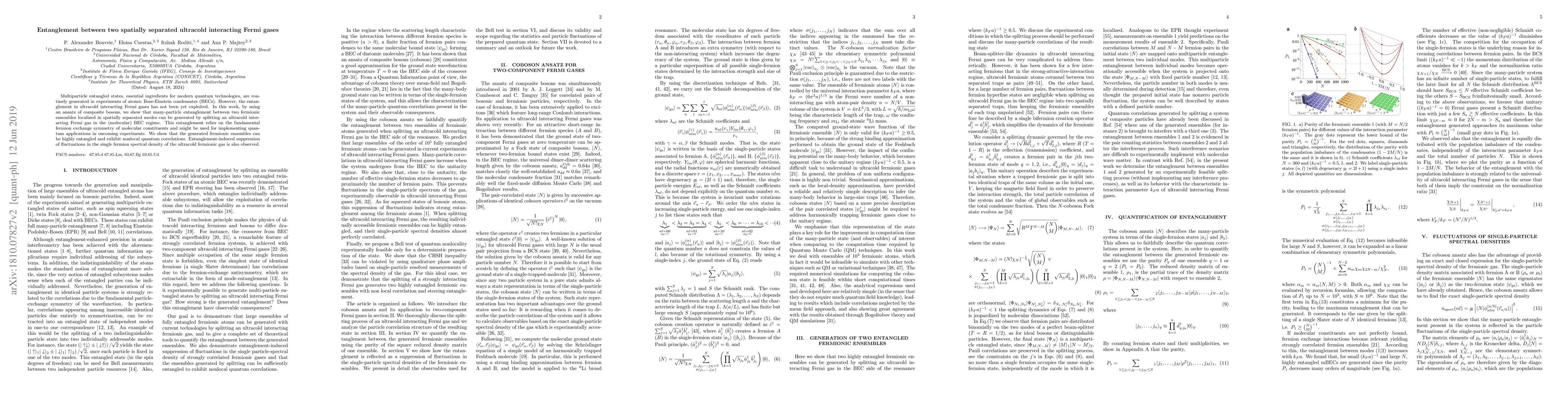 This paper demonstrates the generation of many-particle entanglement between two spatially separated ultracold interacting Fermi gases using an ansatz of composite bosons, showing potential for implementing Bell test experiments to test quantum nonlocality.