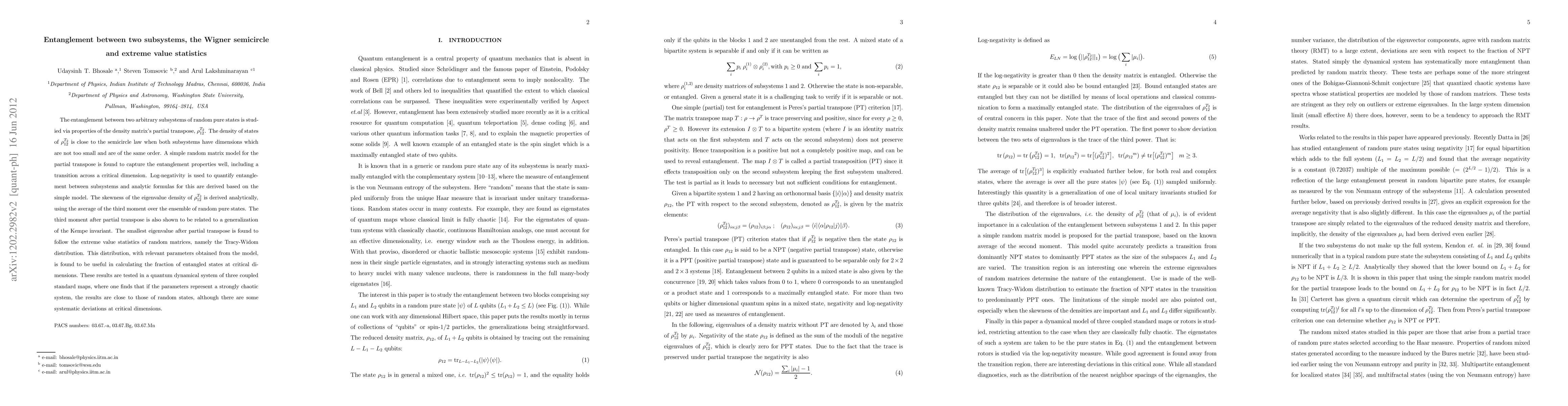The entanglement between two arbitrary subsystems of random pure states is studied via properties of the density matrix's partial transpose, $\rho_{12}^{T_2}$. The density of states of $\rho_{12}^{T_2}$ is close to the semicircle law when both subsystems have dimensions which are not too small and are of the same order. A simple random matrix model for the partial transpose is found to capture the entanglement properties well, including a transition across a critical dimension. Log-negativity is used to quantify entanglement between subsystems and analytic formulas for this are derived based on the simple model. The skewness of the eigenvalue density of $\rho_{12}^{T_2}$ is derived analytically, using the average of the third moment over the ensemble of random pure states. The third moment after partial transpose is also shown to be related to a generalization of the Kempe invariant. The smallest eigenvalue after partial transpose is found to follow the extreme value statistics of random matrices, namely the Tracy-Widom distribution. This distribution, with relevant parameters obtained from the model, is found to be useful in calculating the fraction of entangled states at critical dimensions. These results are tested in a quantum dynamical system of three coupled standard maps, where one finds that if the parameters represent a strongly chaotic system, the results are close to those of random states, although there are some systematic deviations at critical dimensions.