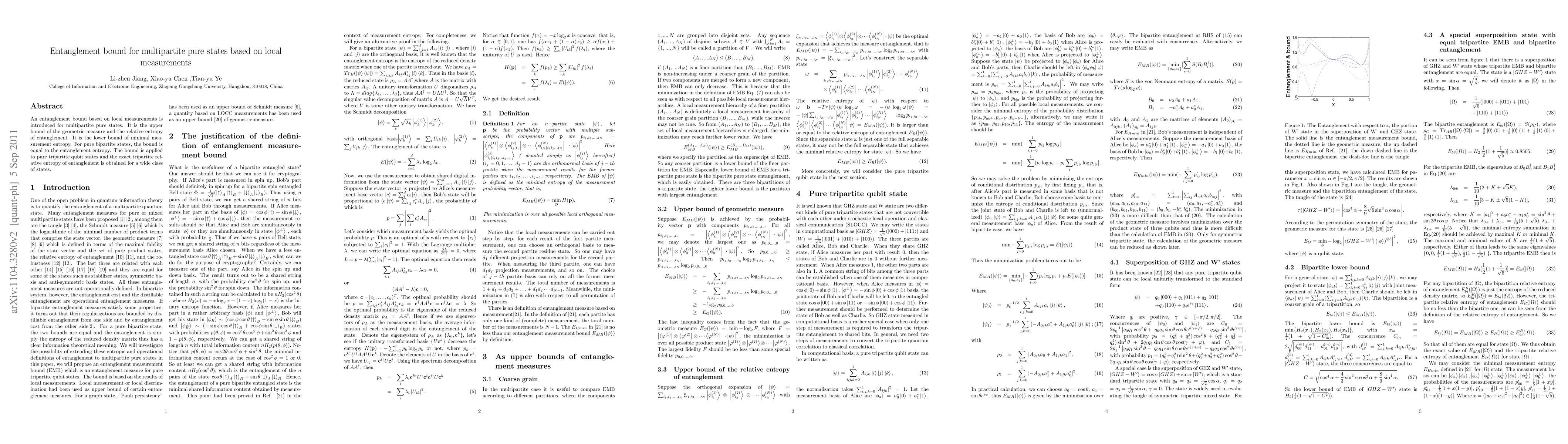 An entanglement bound based on local measurements is introduced for multipartite pure states. It is the upper bound of the geometric measure and the relative entropy of entanglement. It is the lower bound of minimal measurement entropy. For pure bipartite states, the bound is equal to the entanglement entropy. The bound is applied to pure tripartite qubit states and the exact tripartite relative entropy of entanglement is obtained for a wide class of states.