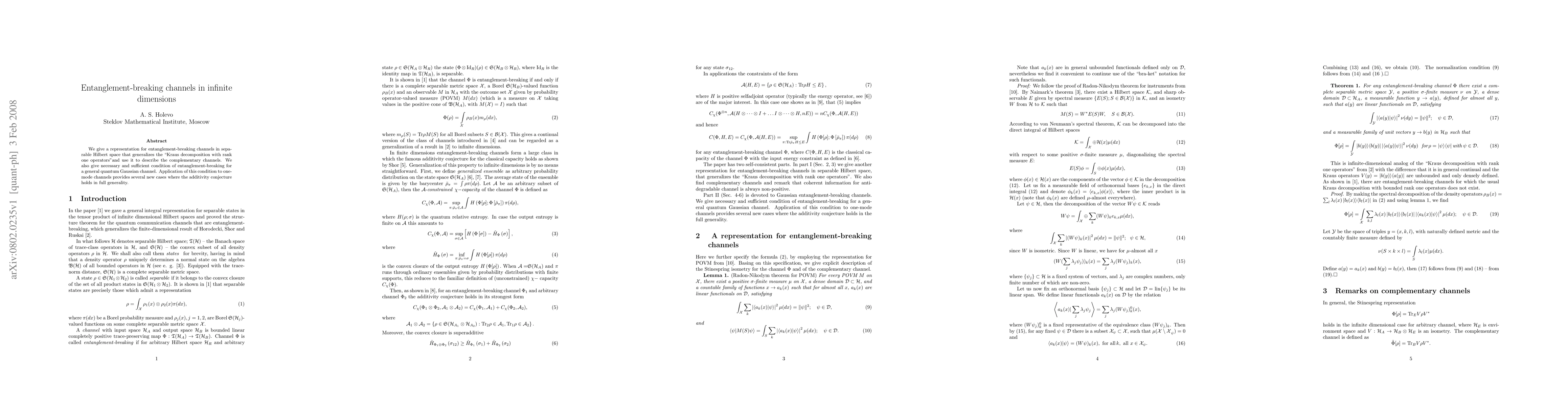 This paper presents a generalized representation for entanglement-breaking channels in infinite-dimensional Hilbert spaces, extending the Kraus decomposition with rank one operators. It also establishes necessary and sufficient conditions for entanglement-breaking in quantum Gaussian channels, confirming the additivity conjecture for several new one-mode cases.