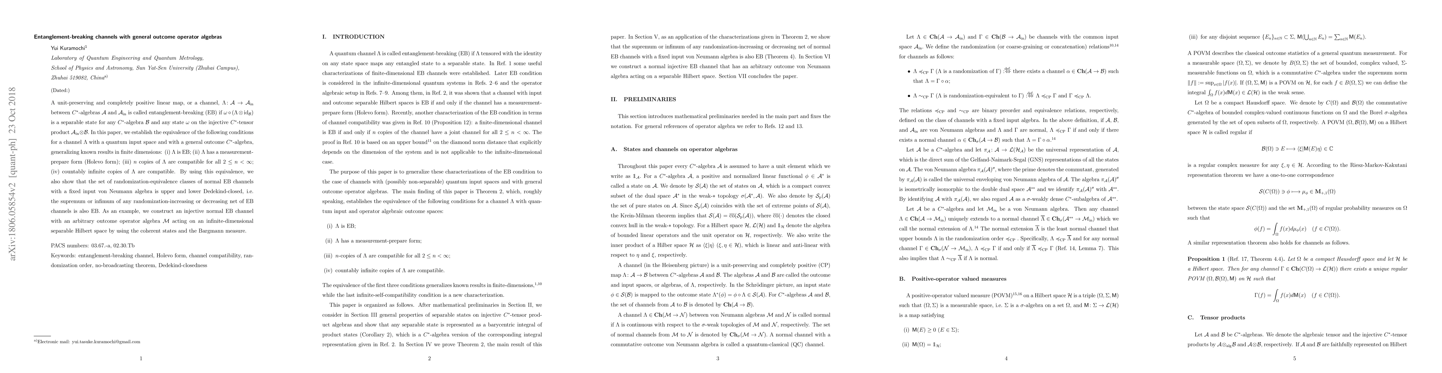A unit-preserving and completely positive linear map, or a channel, $\Lambda \colon \mathcal{A} \to \mathcal{A}_{\mathrm{in}}$ between $C^\ast$-algebras $\mathcal{A}$ and $\mathcal{A}_{\mathrm{in}}$ is called entanglement-breaking (EB) if $\omega \circ( \Lambda \otimes \mathrm{id}_{\mathcal{B}} ) $ is a separable state for any $C^\ast$-algebra $\mathcal{B}$ and any state $\omega$ on the injective $C^\ast$-tensor product $\mathcal{A}_{\mathrm{in}} \otimes \mathcal{B} .$ In this paper, we establish the equivalence of the following conditions for a channel $\Lambda$ with a quantum input space and with a general outcome $C^\ast$-algebra, generalizing known results in finite dimensions: (i) $\Lambda$ is EB; (ii) $\Lambda$ has a measurement-prepare form (Holevo form); (iii) $n$ copies of $\Lambda$ are compatible for all $2 \leq n < \infty ;$ (iv) countably infinite copies of $\Lambda$ are compatible. By using this equivalence, we also show that the set of randomization-equivalence classes of normal EB channels with a fixed input von Neumann algebra is upper and lower Dedekind-closed, i.e. the supremum or infimum of any randomization-increasing or decreasing net of EB channels is also EB. As an example, we construct an injective normal EB channel with an arbitrary outcome operator algebra $\mathcal{M}$ acting on an infinite-dimensional separable Hilbert space by using the coherent states and the Bargmann measure.