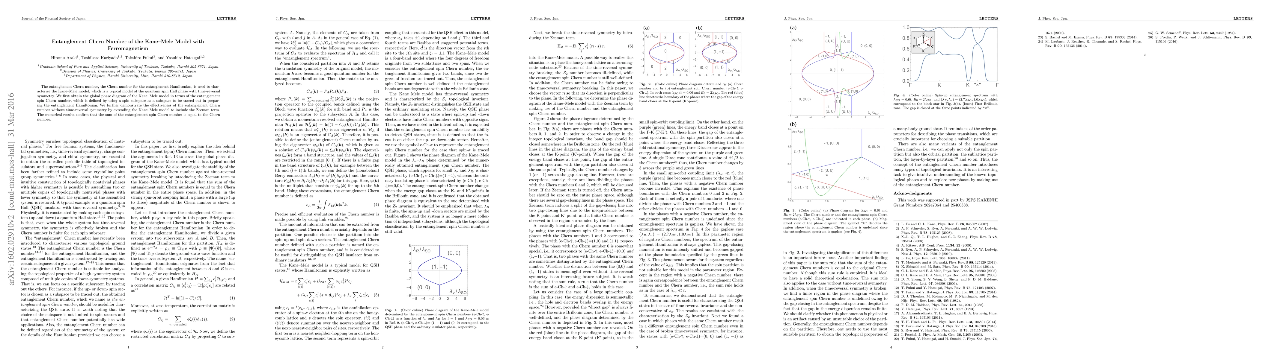 This research characterizes the Kane-Mele model using the entanglement Chern number, defining a global phase diagram based on the entanglement spin Chern number. It extends the model to include ferromagnetism and confirms the sum of the entanglement spin Chern number equals the standard Chern number.