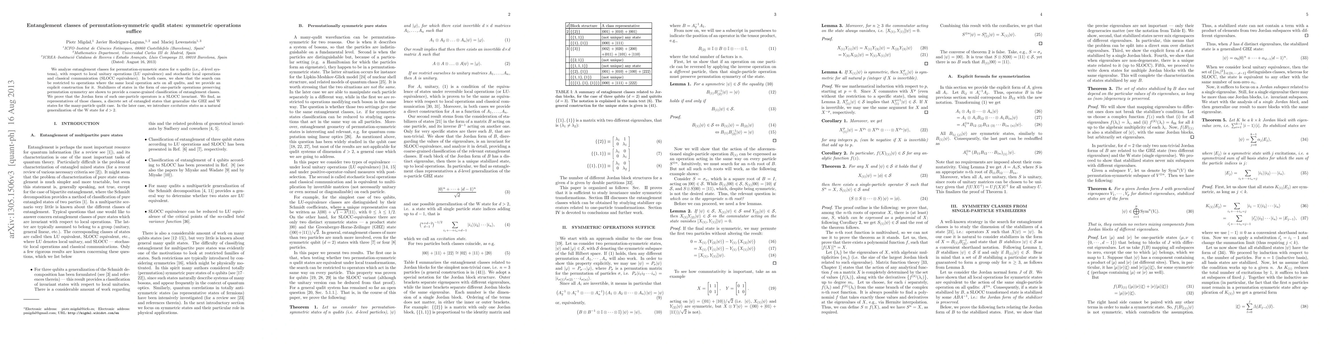 This paper investigates entanglement classes for permutation-symmetric qudit states under local unitary and SLOCC equivalence, demonstrating that symmetric operations suffice. It provides a construction using stabilizers and shows that the Jordan form of one-particle operators is a SLOCC invariant, identifying generalized GHZ and W states as representatives.
