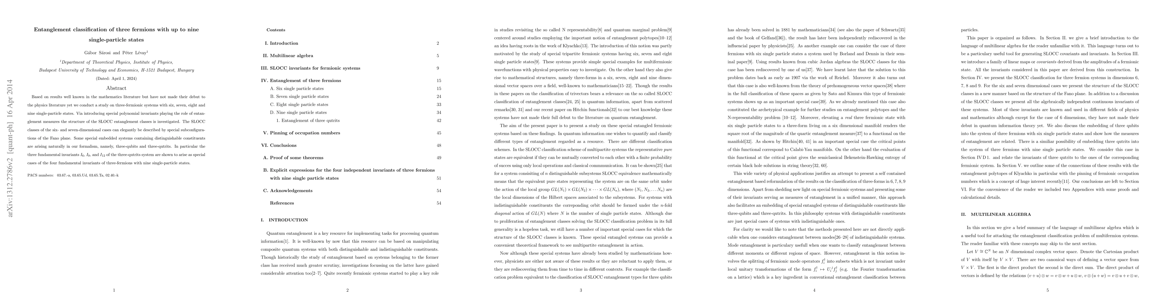 Based on results well known in the mathematics literature but have not made their debut to the physics literature yet we conduct a study on three-fermionic systems with six, seven, eight and nine single-particle states. Via introducing special polynomial invariants playing the role of entanglement measures the structure of the SLOCC entanglement classes is investigated. The SLOCC classes of the six- and seven-dimensional cases can elegantly be described by special subconfigurations of the Fano plane. Some special embedded systems containing distinguishable constituents are arising naturally in our formalism, namely, three-qubits and three-qutrits. In particular the three fundamental invariants $I_6$, $I_9$, and $I_{12}$ of the three-qutrits system are shown to arise as special cases of the four fundamental invariants of three-fermions with nine single-particle states.