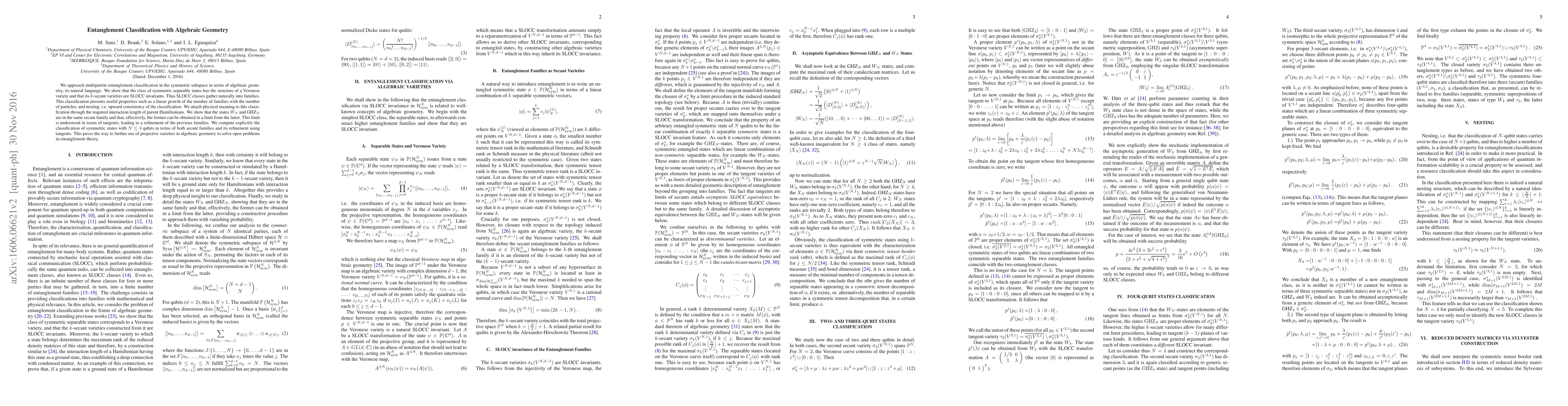 We approach multipartite entanglement classification in the symmetric subspace in terms of algebraic geometry, its natural language. We show that the class of symmetric separable states has the structure of a Veronese variety and that its $k$-secant varieties are SLOCC invariants. Thus SLOCC classes gather naturally into families. This classification presents useful properties such as a linear growth of the number of families with the number of particles, and nesting, i.e. upward consistency of the classification. We attach physical meaning to this classification through the required interaction length of parent Hamiltonians. We show that the states $W_N$ and GHZ$_N$ are in the same secant family and that, effectively, the former can be obtained in a limit from the latter. This limit is understood in terms of tangents, leading to a refinement of the previous families. We compute explicitly the classification of symmetric states with $N\leq 4$ qubits in terms of both secant families and its refinement using tangents. This paves the way to further use of projective varieties in algebraic geometry to solve open problems in entanglement theory.