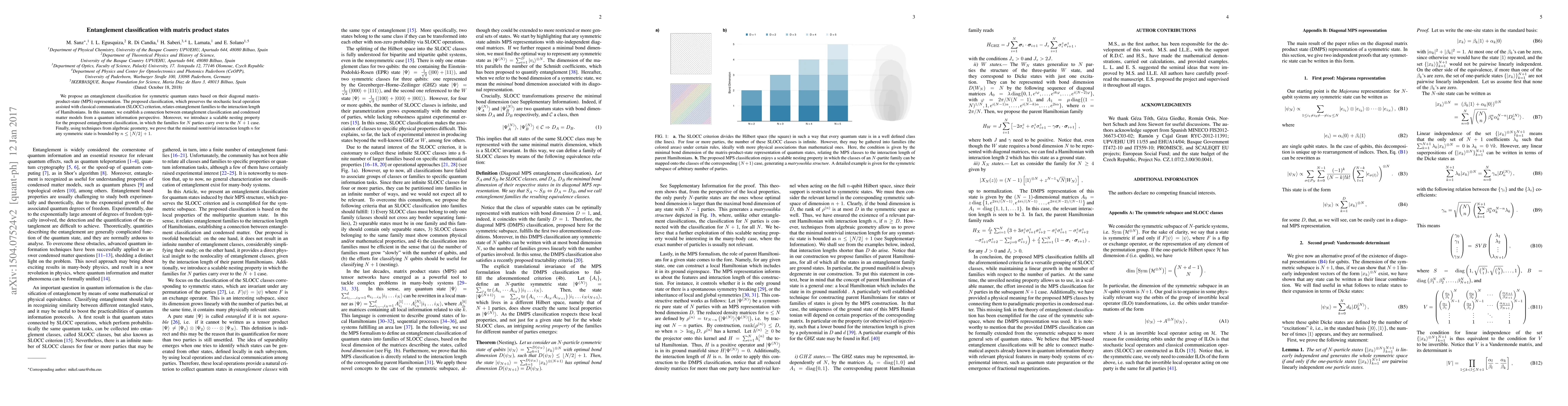 This paper introduces a novel entanglement classification method for quantum states based on their matrix-product-state structure, particularly focusing on the symmetric subspace. It establishes a connection between entanglement families and the interaction length of Hamiltonians, marking the first link between entanglement classification and condensed matter physics.