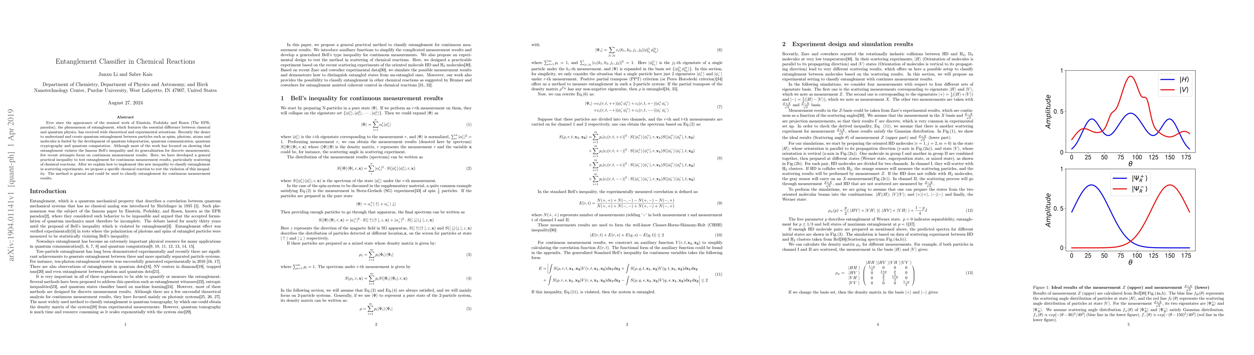 Ever since the appearance of the seminal work of Einstein, Podolsky and Rosen (The EPR-paradox), the phenomenon of entanglement, which features the essential difference between classical and quantum physics, has received wide theoretical and experimental attentions. Recently the desire to understand and create quantum entanglement between particles such as spins, photons, atoms and molecules is fueled by the development of quantum teleportation, quantum communication, quantum cryptography and quantum computation. Although most of the work has focused on showing that entanglement violates the famous Bell's inequality and its generalization for discrete measurements, few recent attempts focus on continuous measurement results. Here, we have developed a general practical inequality to test entanglement for continuous measurement results, particularly scattering of chemical reactions. After we explain how to implement this new inequality to classify entanglement in scattering experiments, we propose a specific chemical reaction to test the violation of this inequality. The method is general and could be used to classify entanglement for continuous measurement results.
